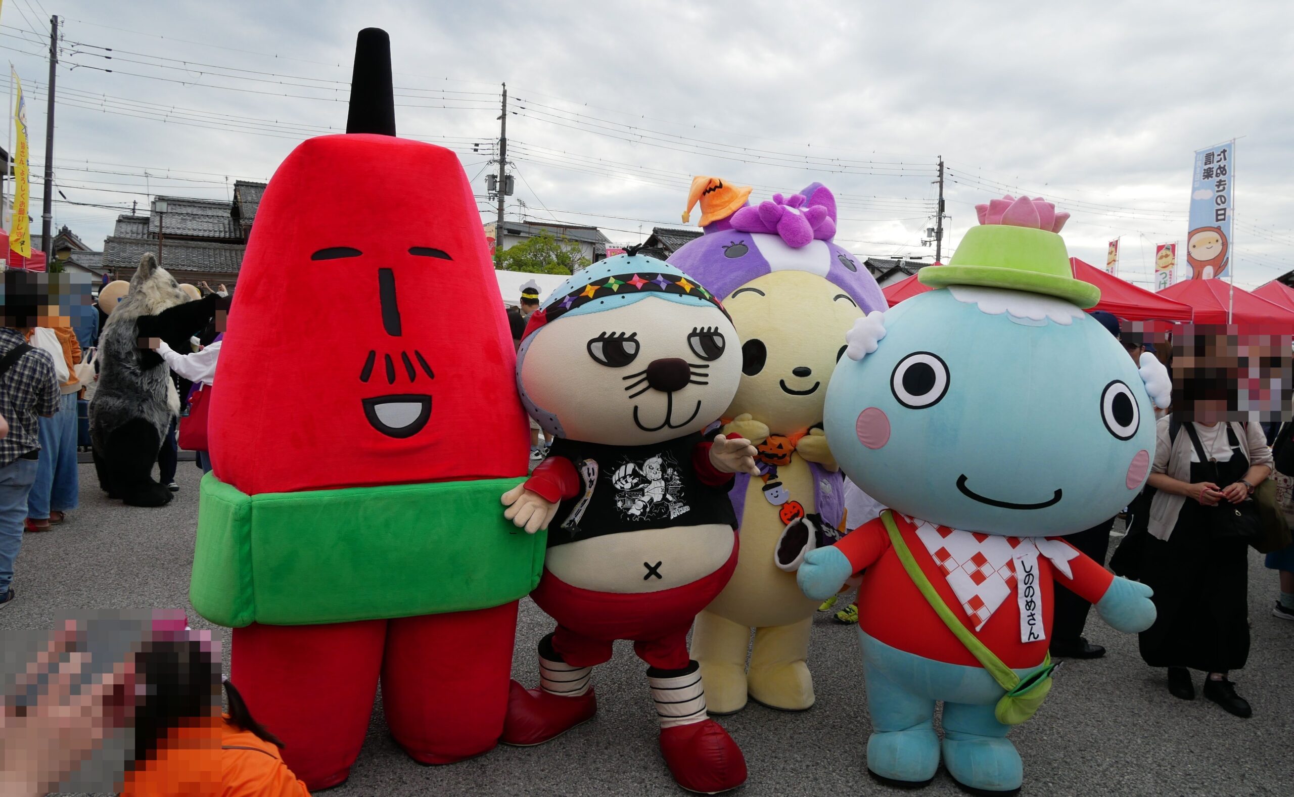 下の写真は、2022年に滋賀県彦根市にある彦根城を中心に開催された「ご当地キャラ博in彦根2022」より、ハロウィンヴァージョンで登場です。 (右側の)「あいさいさん」(愛知県愛西市)とのコラボです。