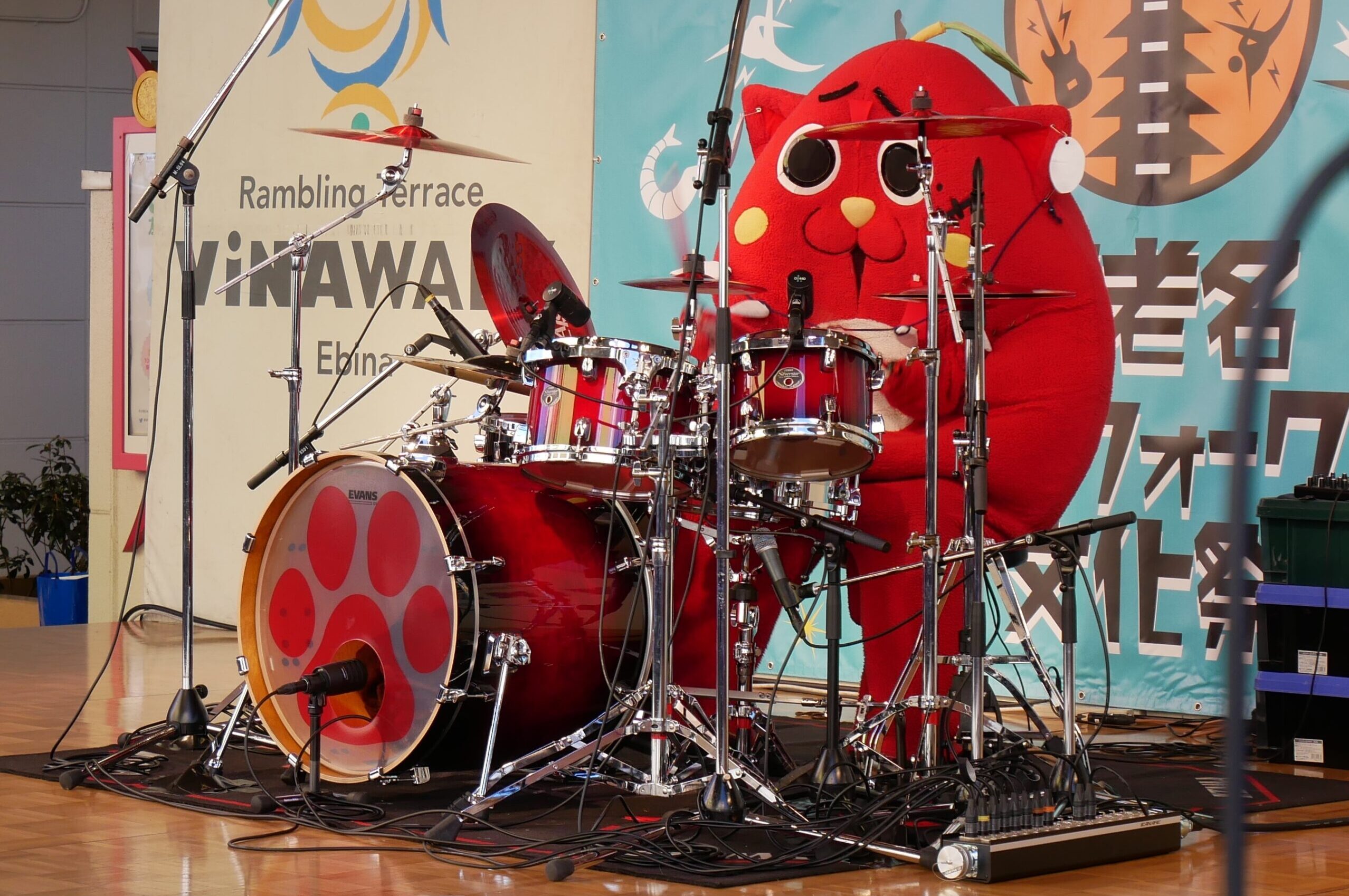 「にゃんごすたー」は、リンゴと猫ちゃんをモチーフとした青森県黒石市出身のゆるキャラでドラムの演奏ができます。(すごく上手いです。(^^))
