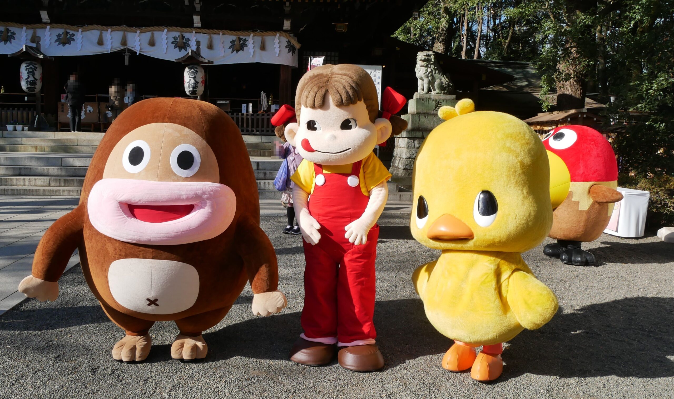 こちらの写真は、2025年の「第32回 杉並花笠祭り」より、(右側より)「ひよこちゃん」(日清食品株式会社)、「ペコちゃん」(株式会社不二家)との夢のコラボです。