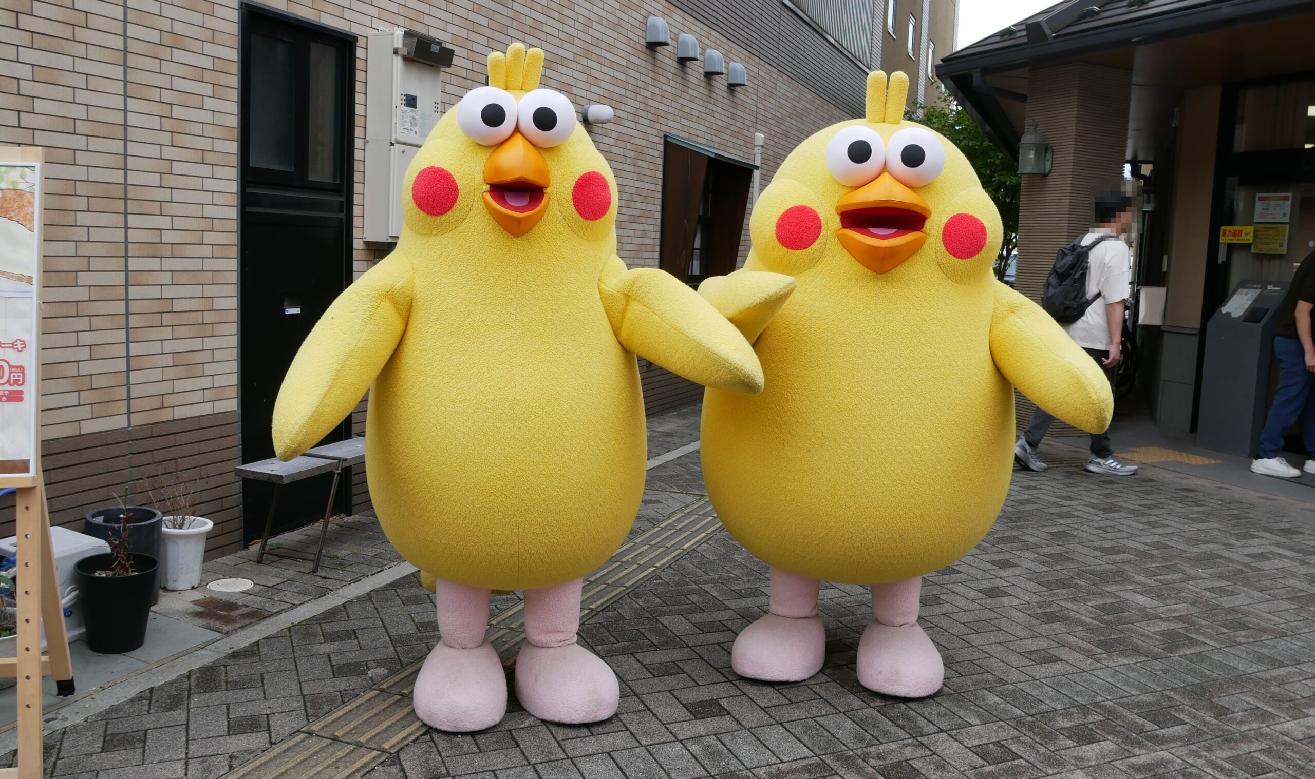 こちらの写真は、2022年に滋賀県彦根市にある彦根城を中心に開催された「ご当地キャラ博in彦根2022」より、「ポインコ兄弟」の登場です。(左側が)「ポインコ兄」、(右側が)「ポインコ弟」です。