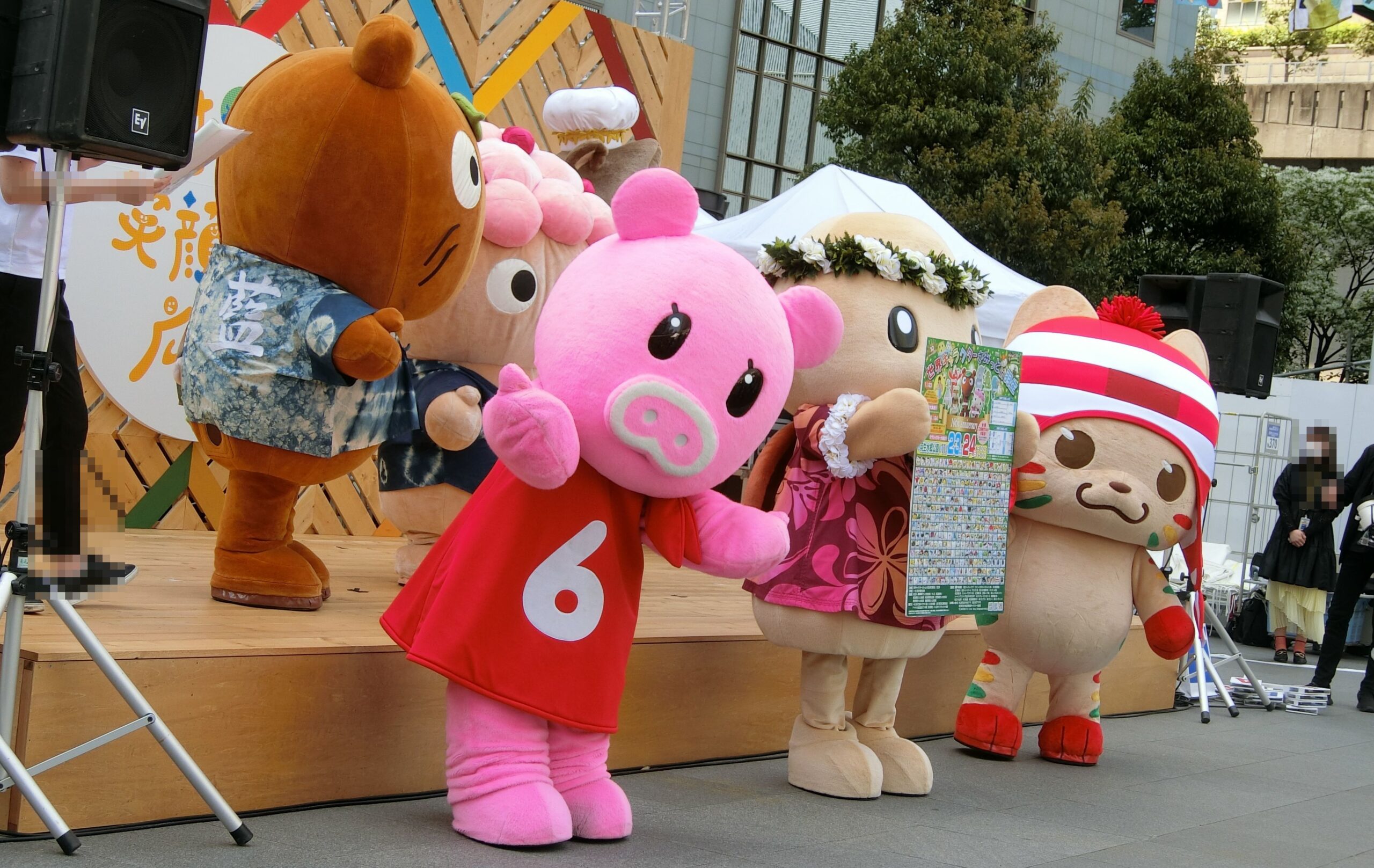 「ワシんたん」の右隣にいる群馬県館林市のぽんちゃんに似ているゆるキャラ(不明です。このゆるキャラ知っている方、私に連絡して下さい。)その隣は「豆夢(とむ)」(アメリカ大使館のゆるキャラ)です。