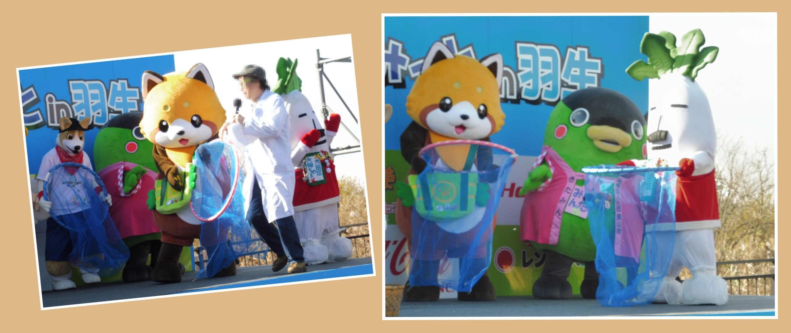 こちらの写真は、2017年の「世界キャラクターさみっと in 羽生」からの写真より、(左側の)「コギ坊」(北海道小樽市)、(右から)「ダイコン爺さん」(千葉県市川市)、「きたみん」(東京世田谷区喜多見)とのコラボです。