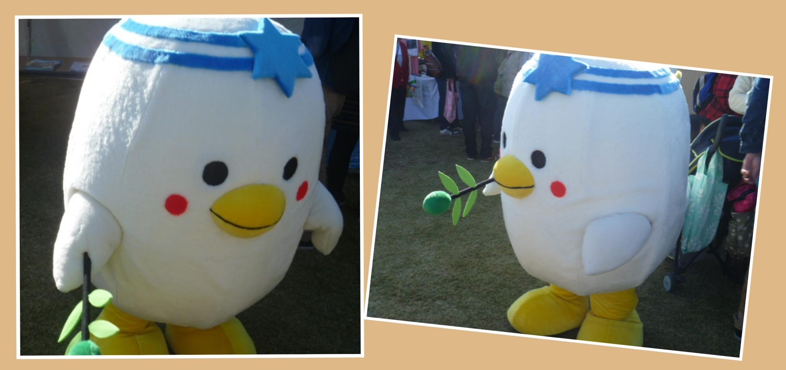こちらの写真は、2014年の「世界キャラクターさみっと in 羽生」より、「シャロウムちゃん」の登場です。「シャロウムちゃん」が持っているものはイスラエルの特産品であり、平和の象徴でもあるオリーブです。