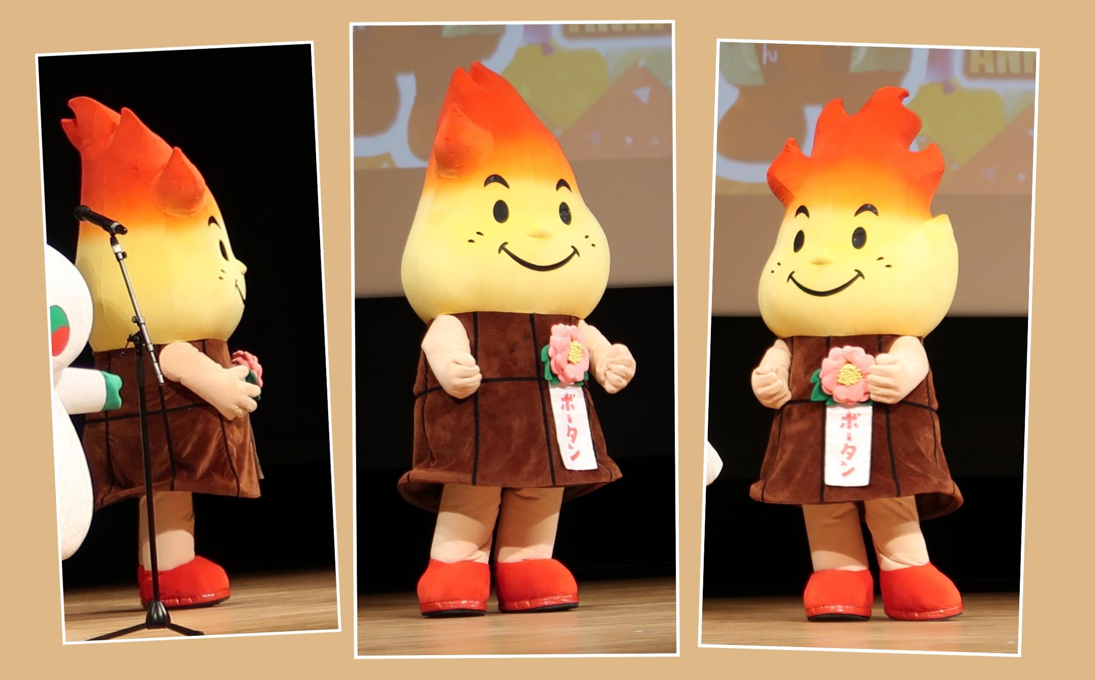 こちらの写真は、2023年に埼玉県羽生市で行われた「ムジナもん 誕生日会」より、横側、斜め左、斜め右から見た「ボータン」です。