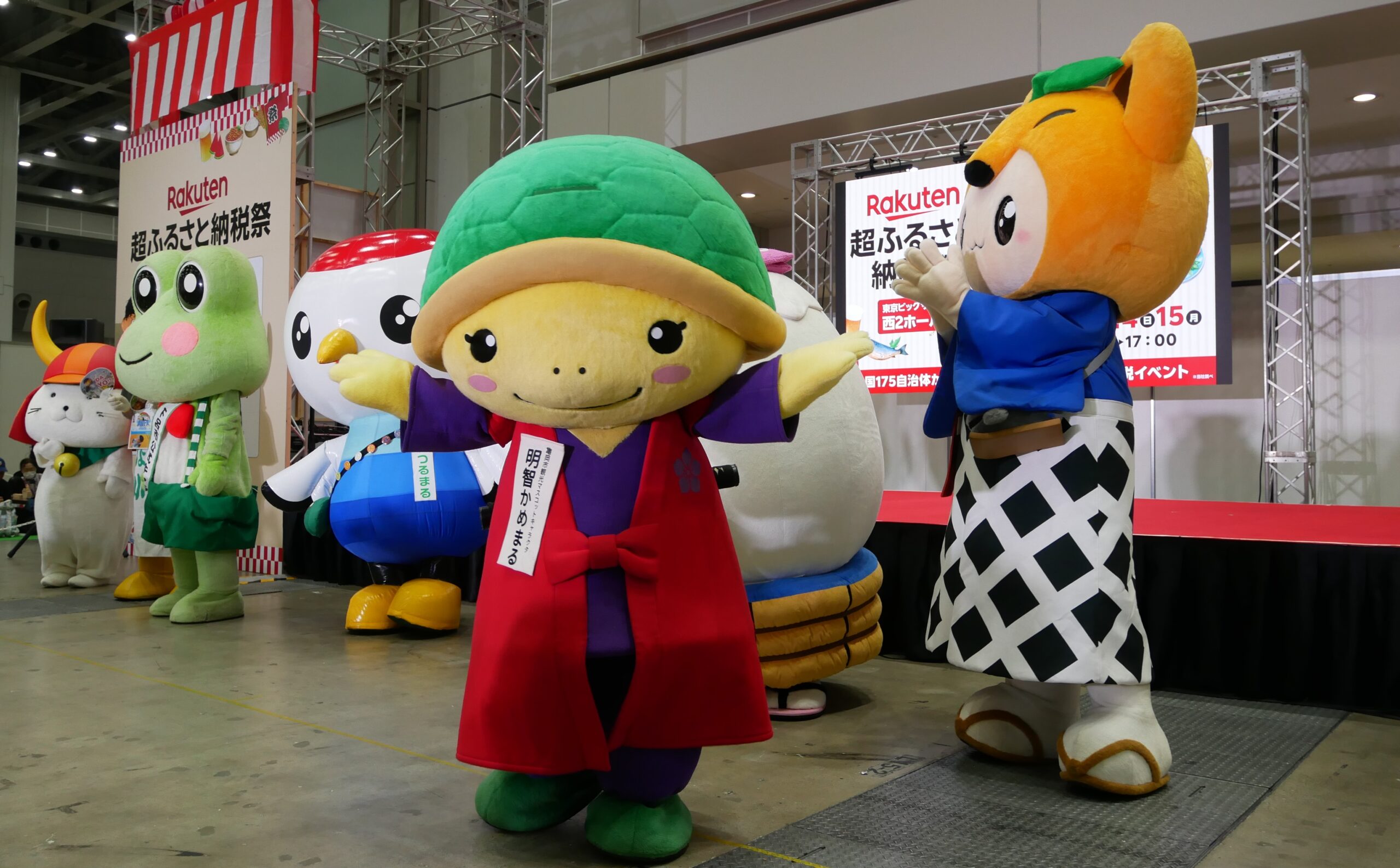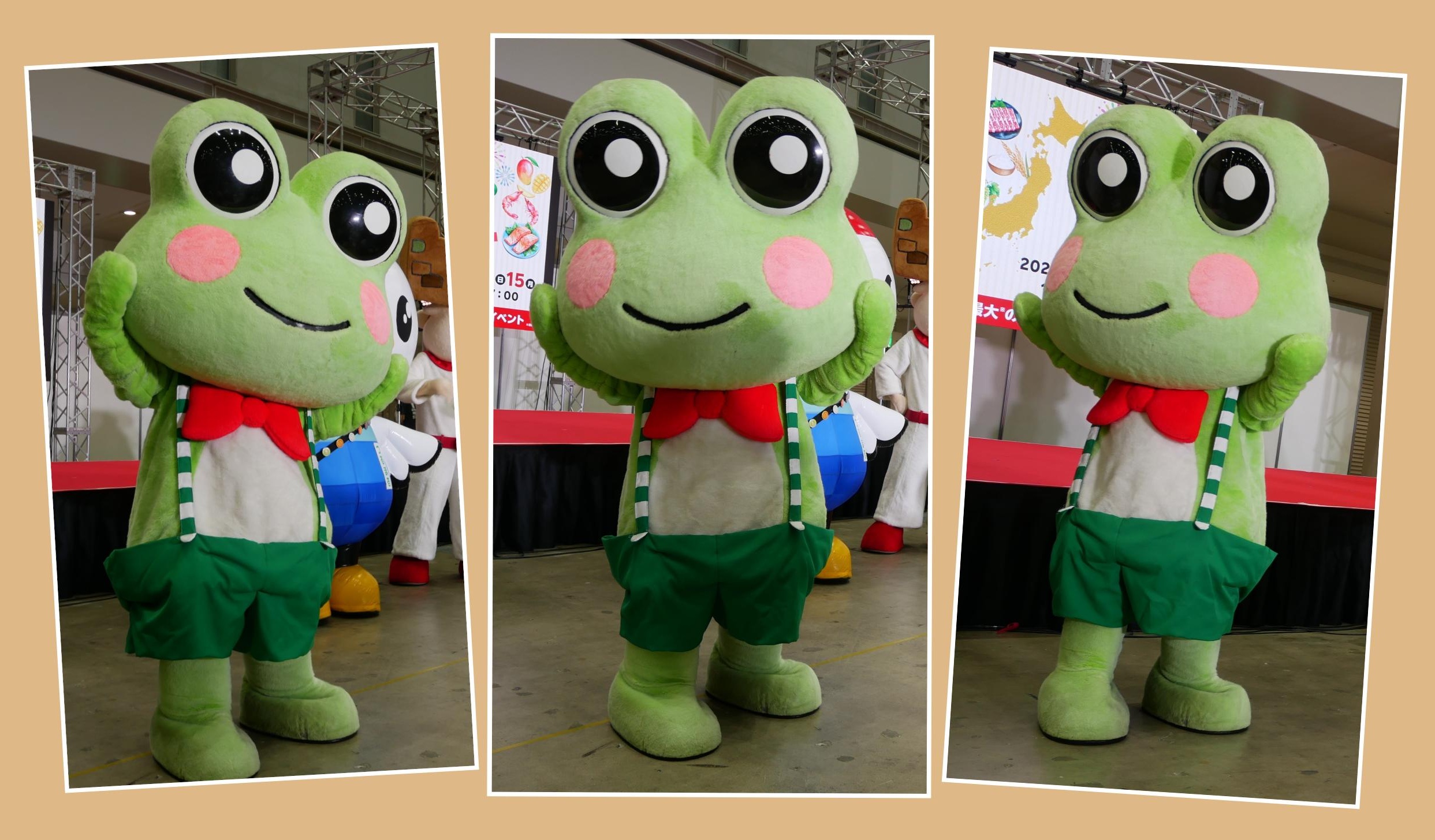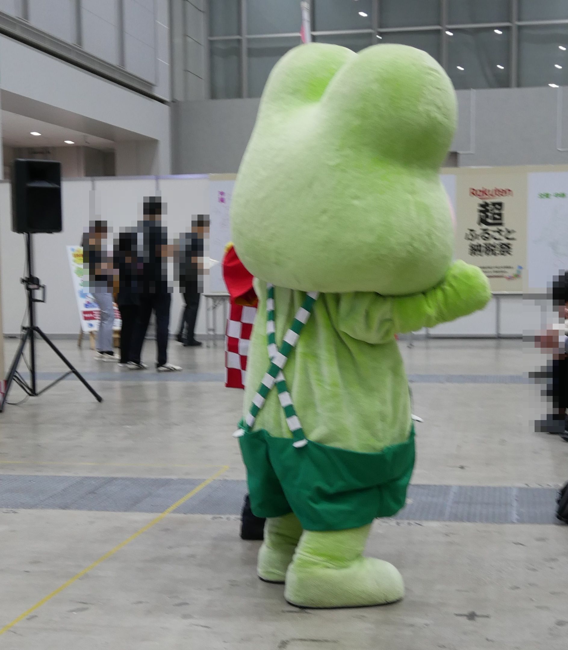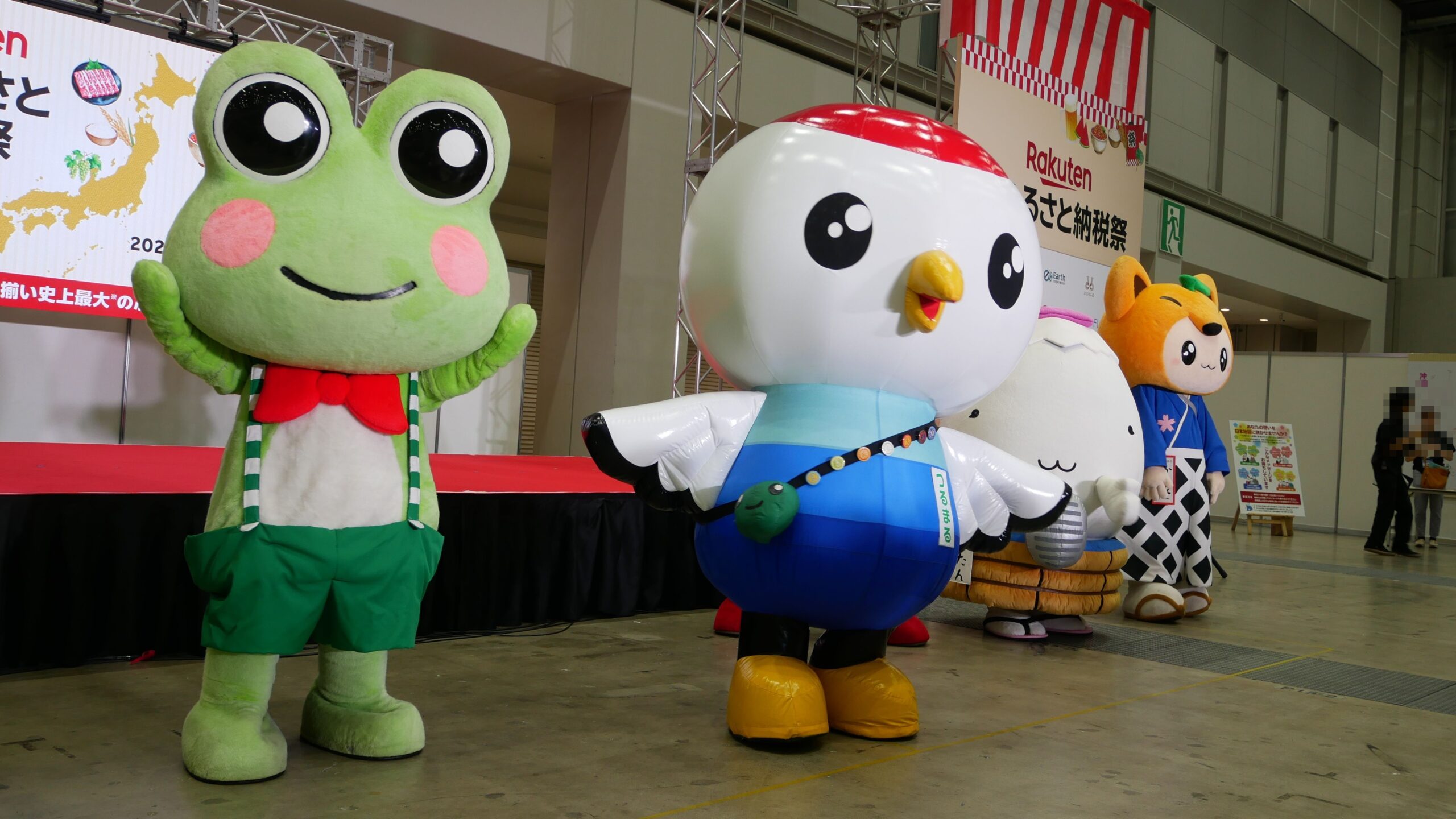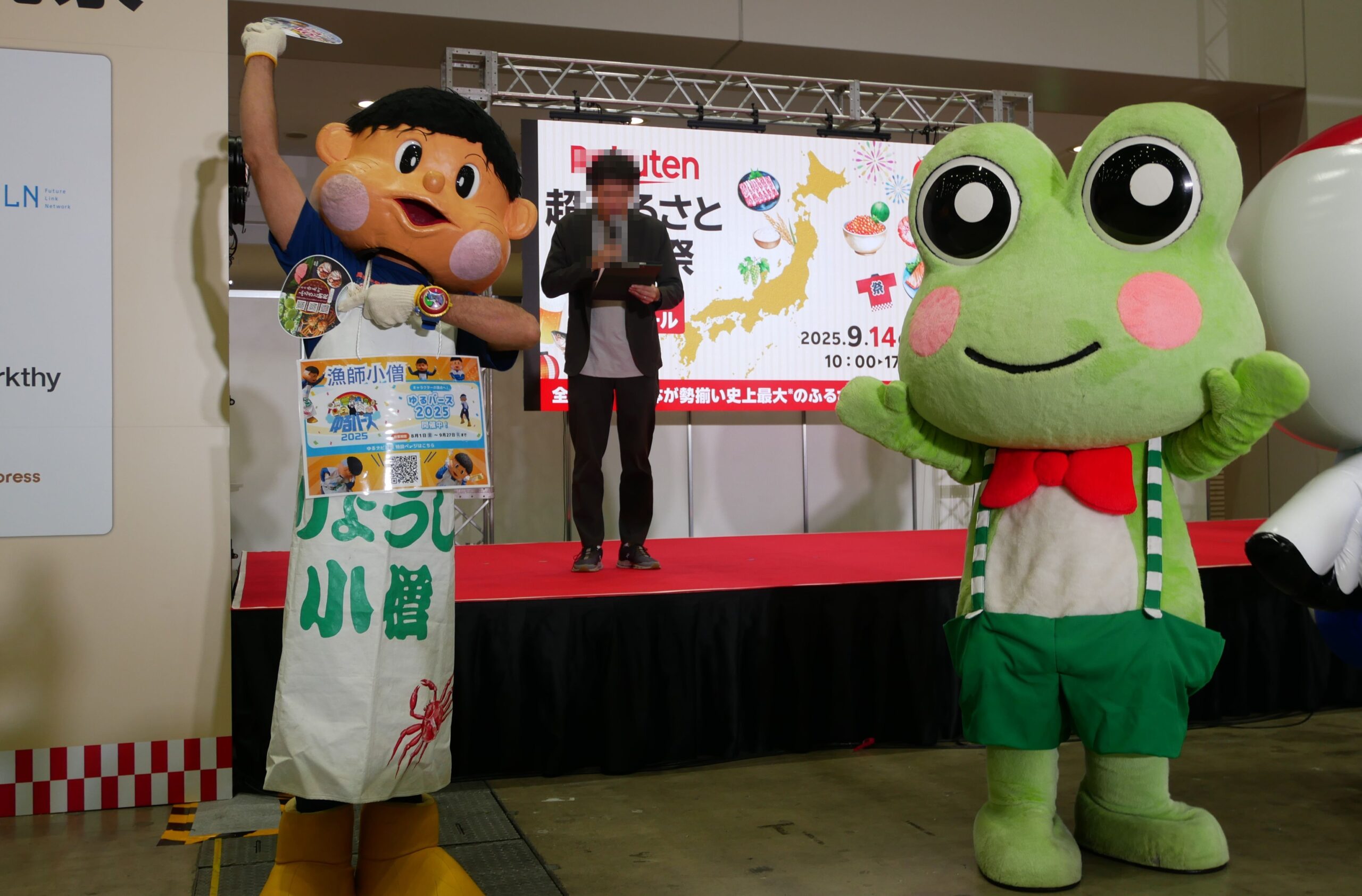 こちらの写真は、2025年に東京ビッグサイトで開催された、楽天超ふるさと納税祭より、「げろぐるくん」の登場です。