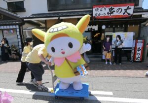 こちらの写真は、2022年に千葉県の成田市で行われた「ご当地キャラ成田詣」より、表参道を走る「はねぴょん」です。