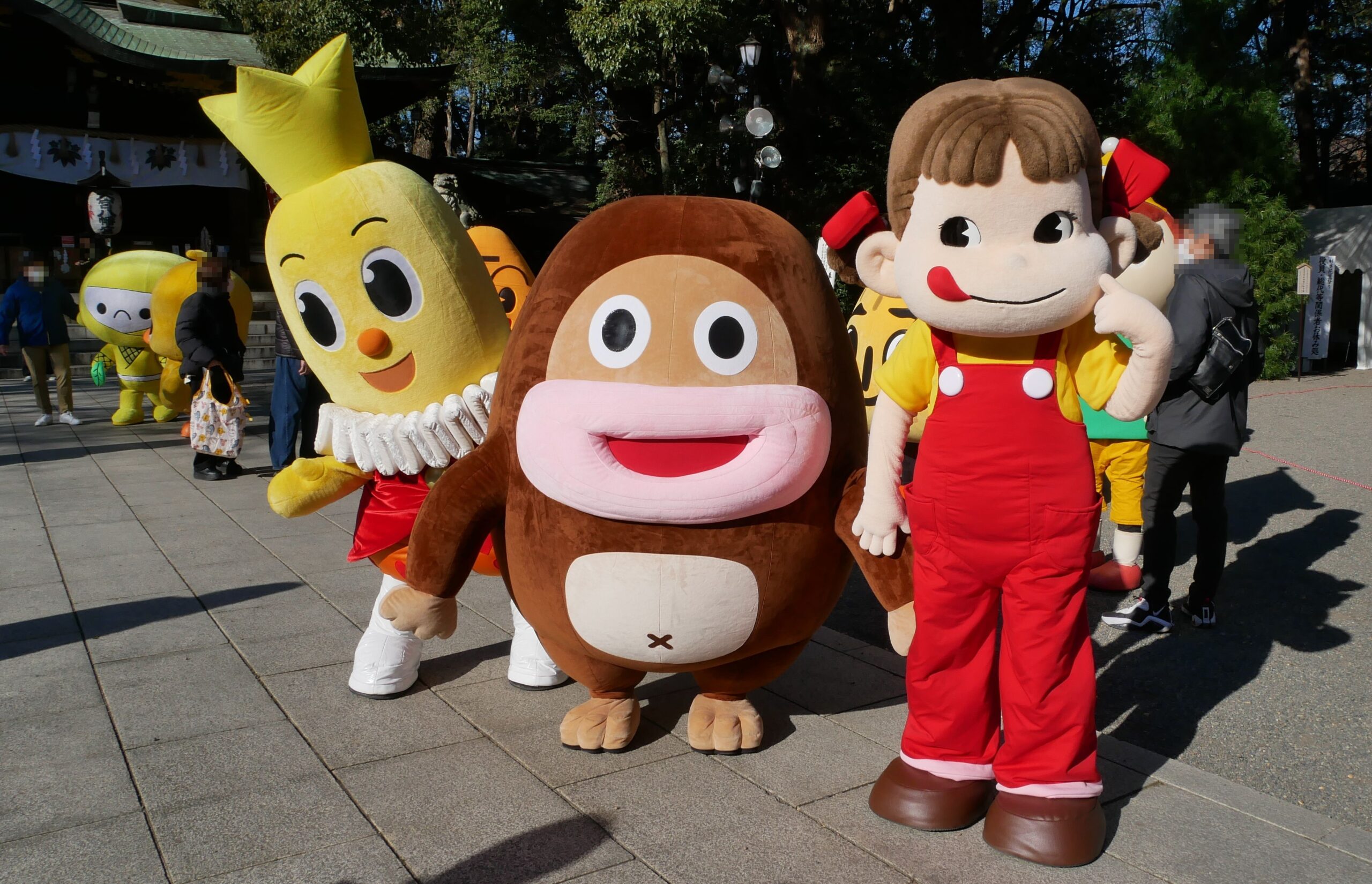こちらの写真は、2025年に東京都杉並区にある大宮八幡宮で開催された「第32回 杉並花笠祭り」より、(右側より)「ペコちゃん」(株式会社不二家)、「チョコジロー」(株式会社 正栄デリシィ)とのお菓子の会社同士夢のコラボです。