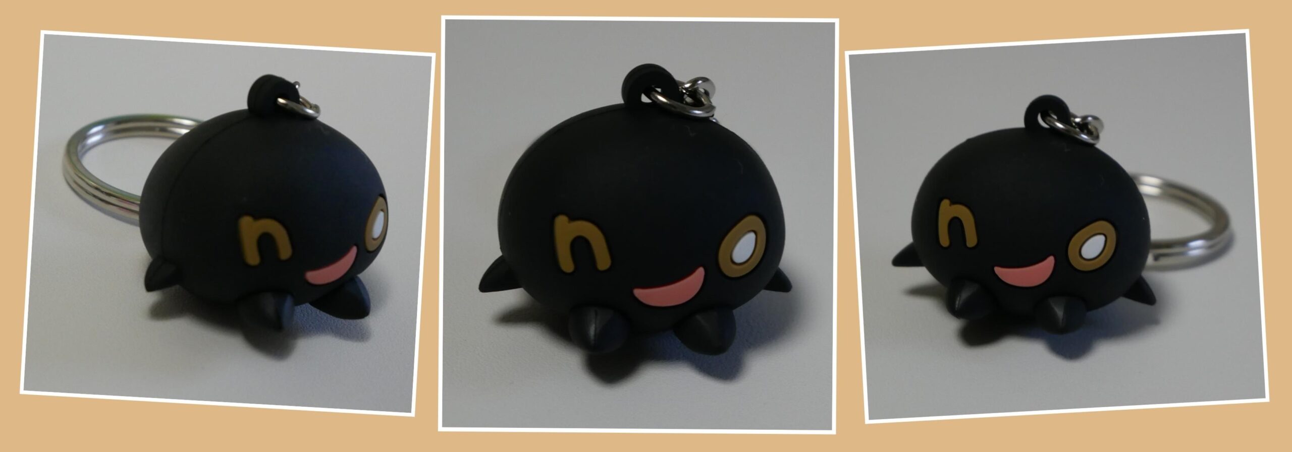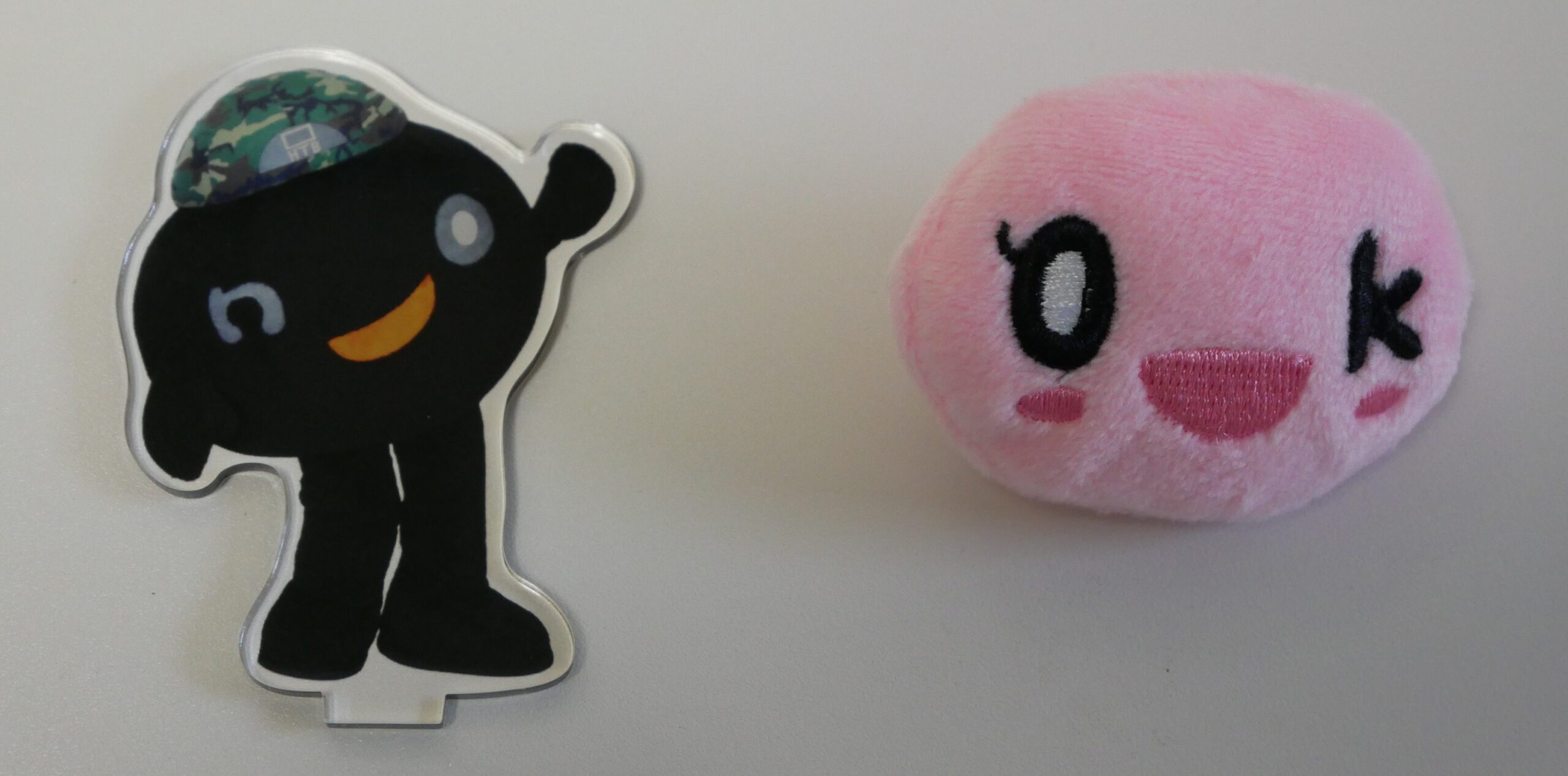 (左側が)「noちゃん」です。アクリルスタンドを購入しました。確かに黒い体で右目が「o」、左目が「n」でした。(右側が)「okちゃん」です。人形を購入しました。確かに左目が「o」、右目が「k」でした。
