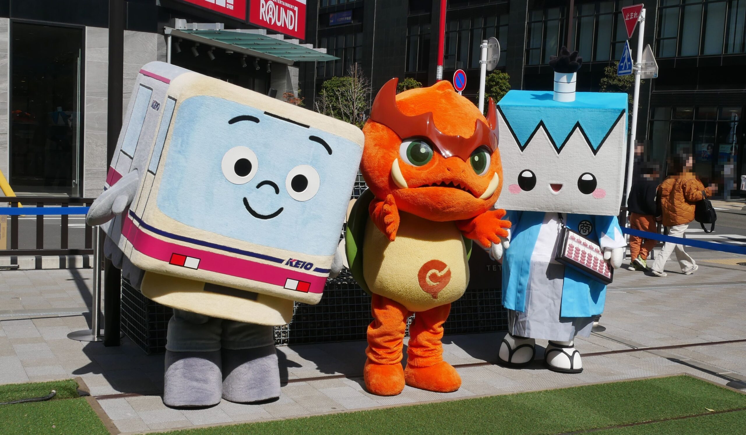 こちらの写真は、2026年にトリエ京王調布で開催された「春のわくわく体験フェスタ」より、(左側より)「けい太くん」(京王電鉄株式会社)、「ガチョラ」(「映画のまち調布」応援キャラクター)とのコラボです。