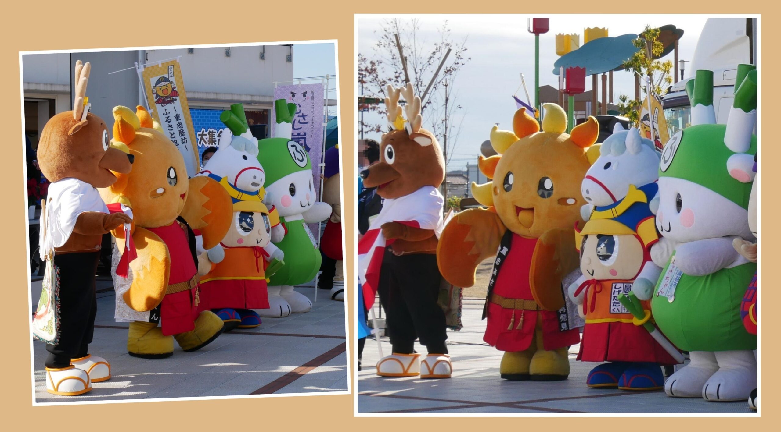(左側の)「タノくん」(岩手県下閉伊郡田野畑村)、(右側より)「ふっかちゃん・しげただくん」(埼玉県深谷市)とのコラボです。