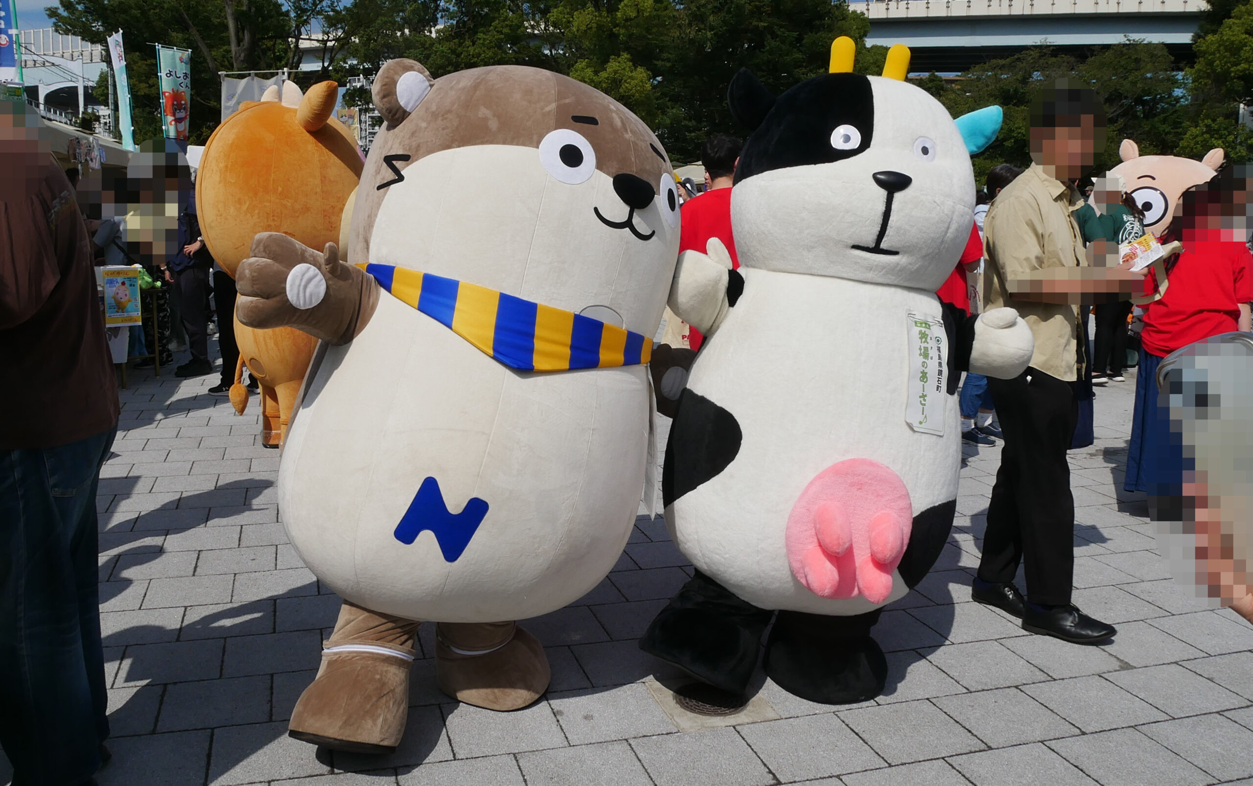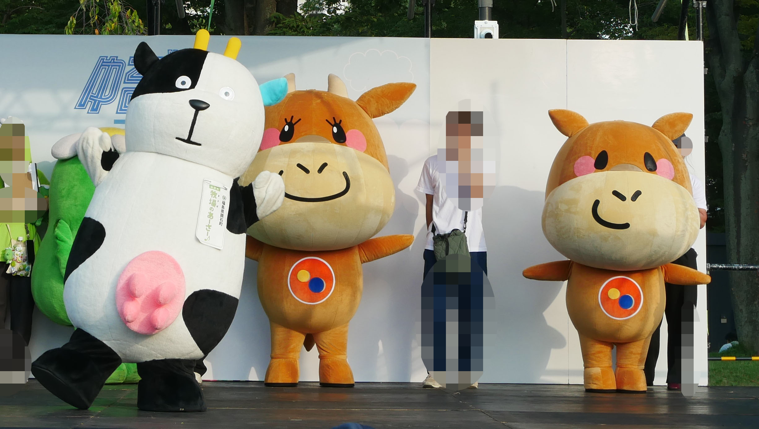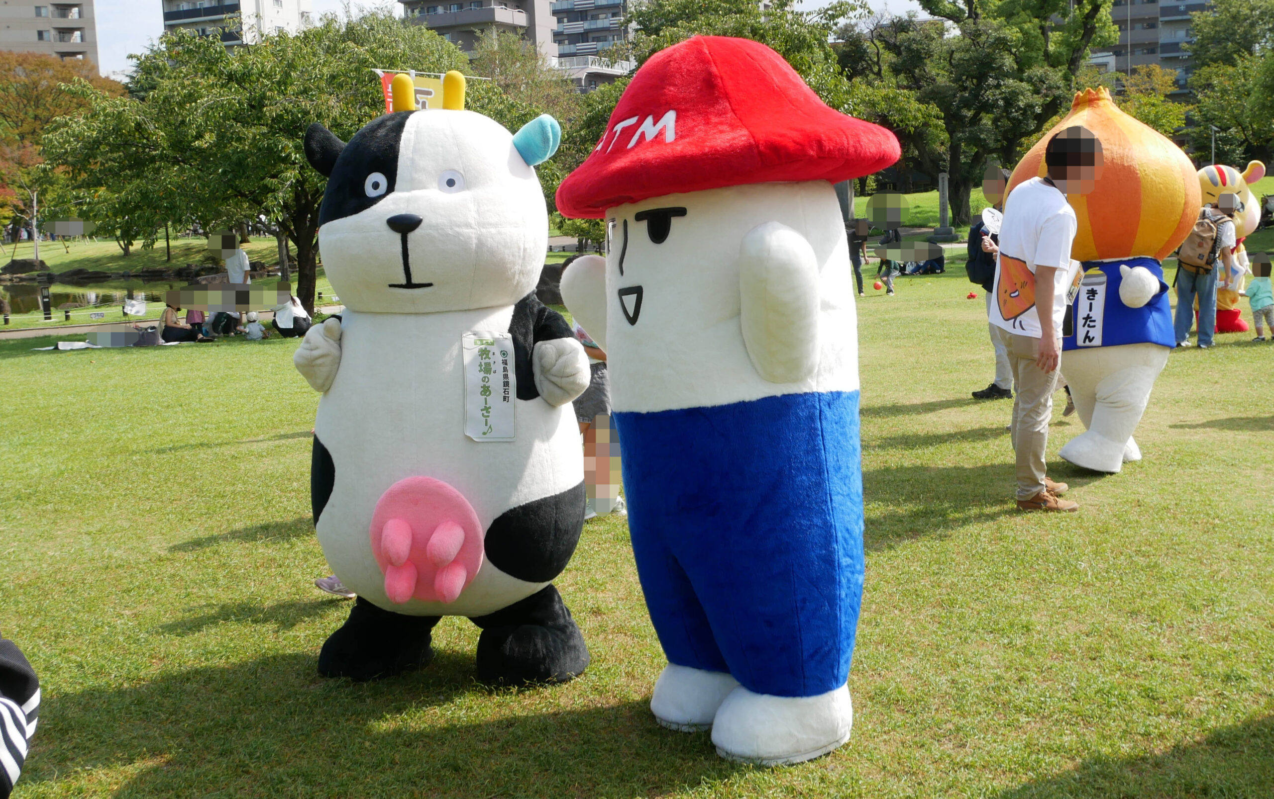 こちらの写真は、2025年に東京墨田区にある隅田公園で開催された「ゆるバース2025」より、(左側の)「マッキー・ヤッキー」(株式会社松屋フーズ )と牛キャラクター同士のコラボです。