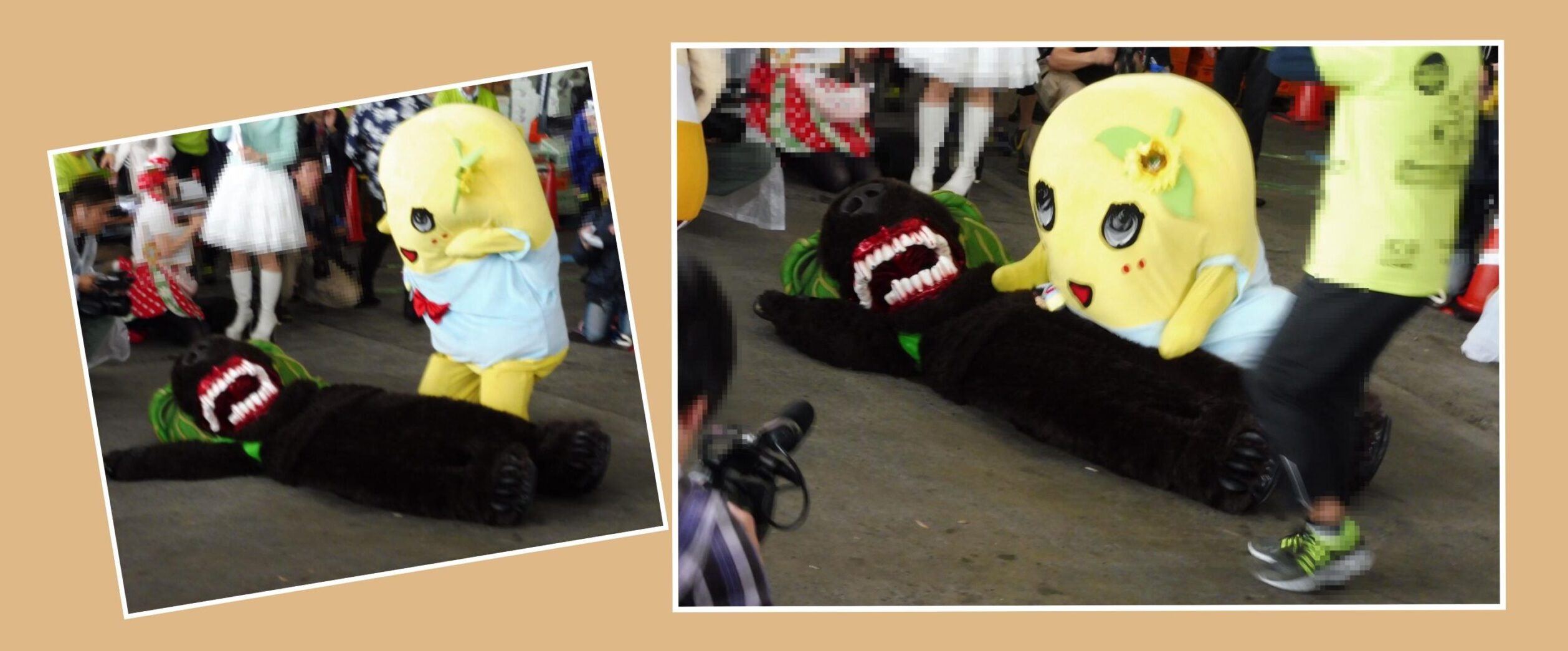 こちらの写真は、2015年の秋に開催された「船橋市場だヨ!全員集合(2015年)」より、「ふなっしー」VS「メロン熊」のプロレスバトルです。