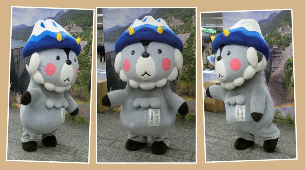 (右側の)「くろにょん」(黒部ダムマスコットキャラクター)との長野県キャラクター同士のツーショットです。