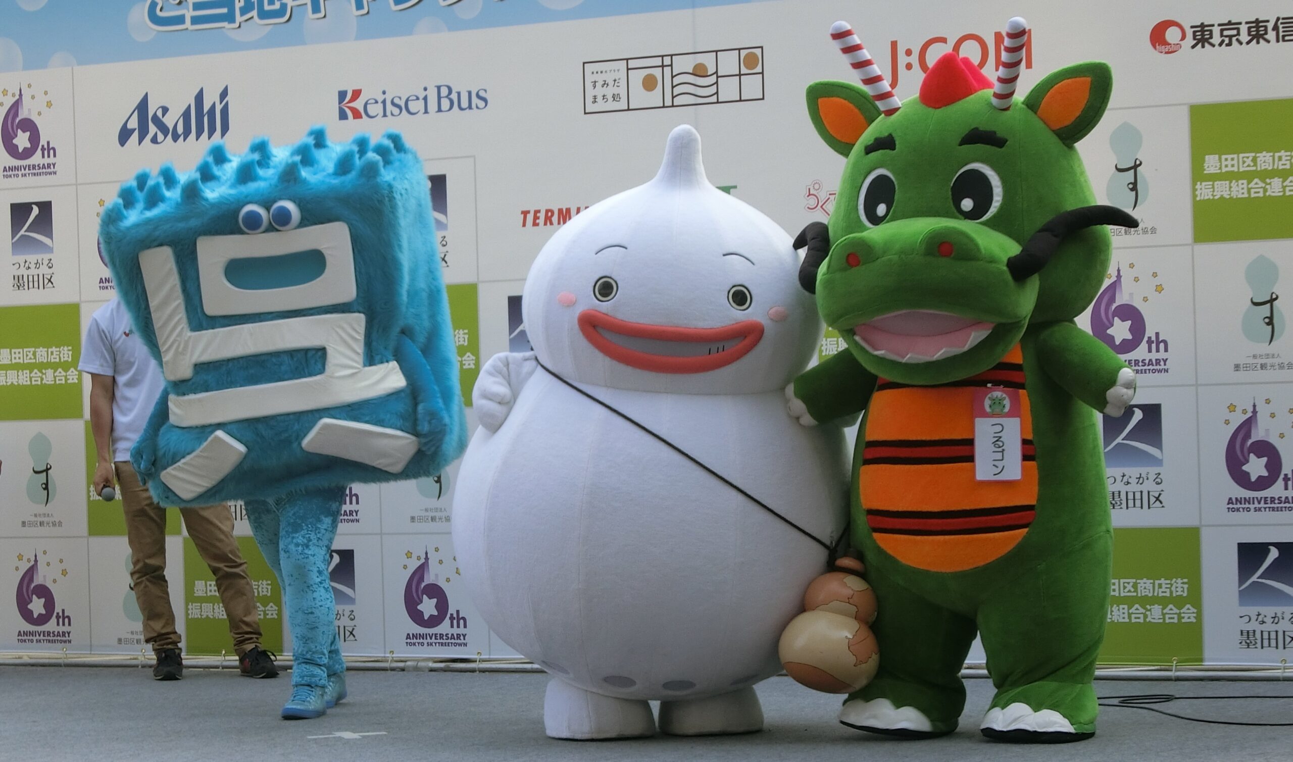 こちらの写真は、2018年に東京都のスカイツリー付近で行われた「ご当地キャラクターフェスティバルinすみだ 2018」より、「しまばらん」の登場です。