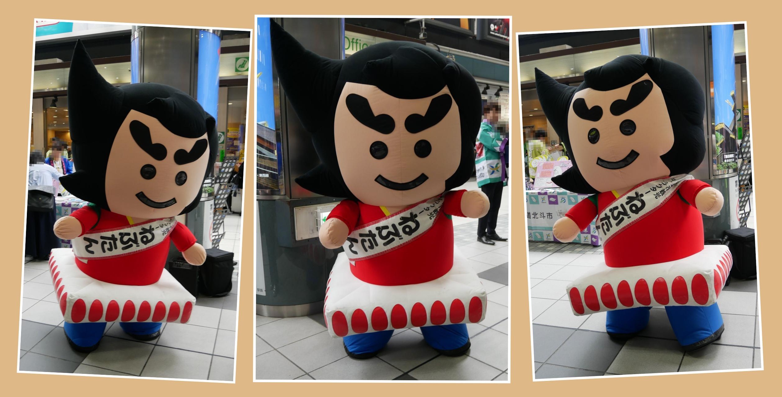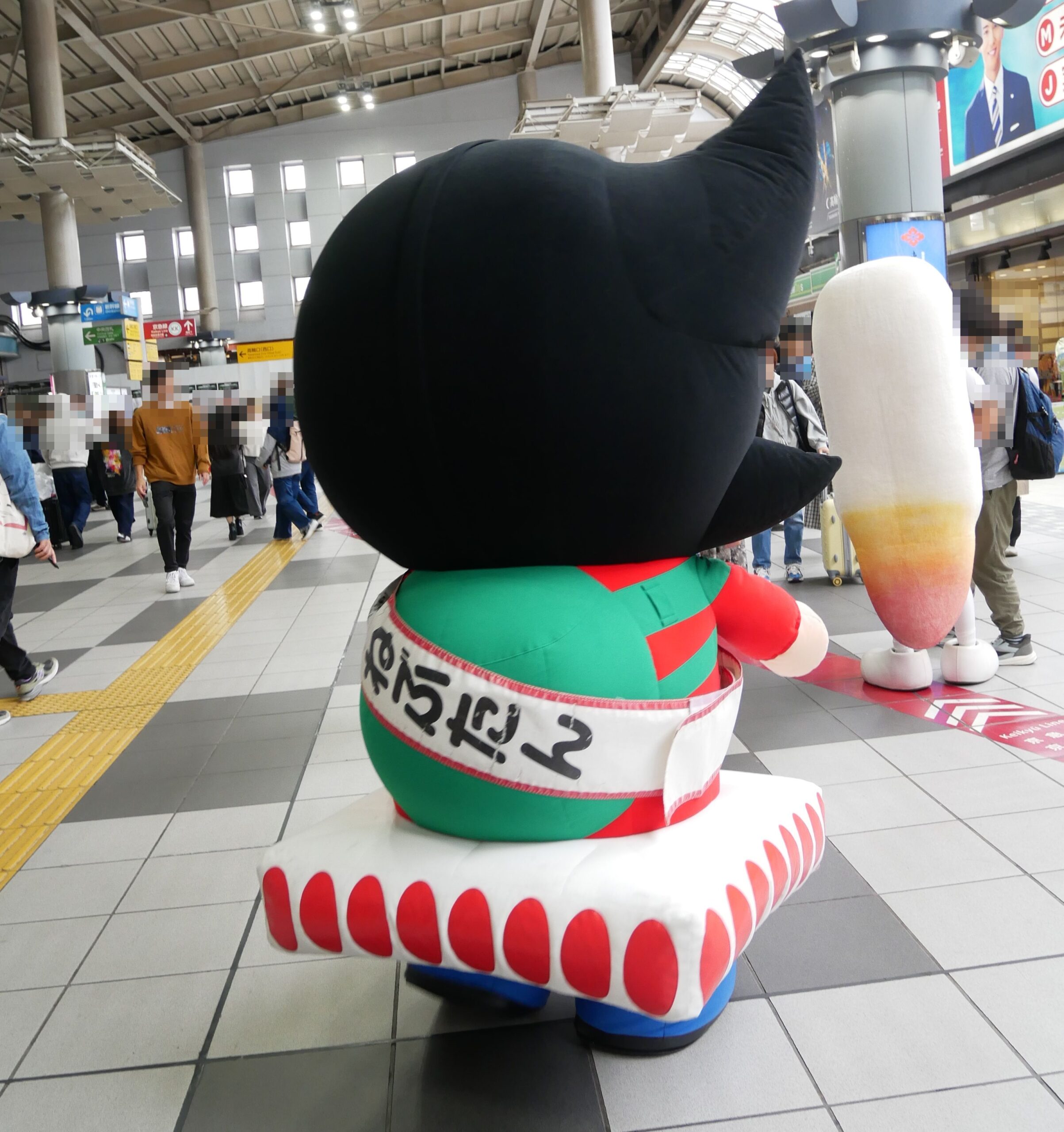 こちらの写真は、2025年に東京の品川駅のみどりの窓口付近で開催された、「青森・函館観光キャンペーン」より、(右側の)「ねぶたん」の登場です。