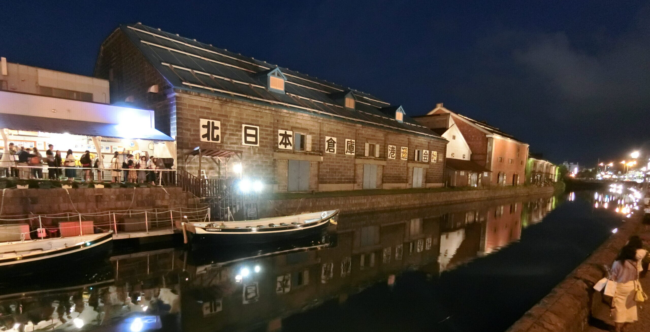 夜の小樽運河は、ガス燈がライトアップされ、昼とは違った幻想的な雰囲気でした。