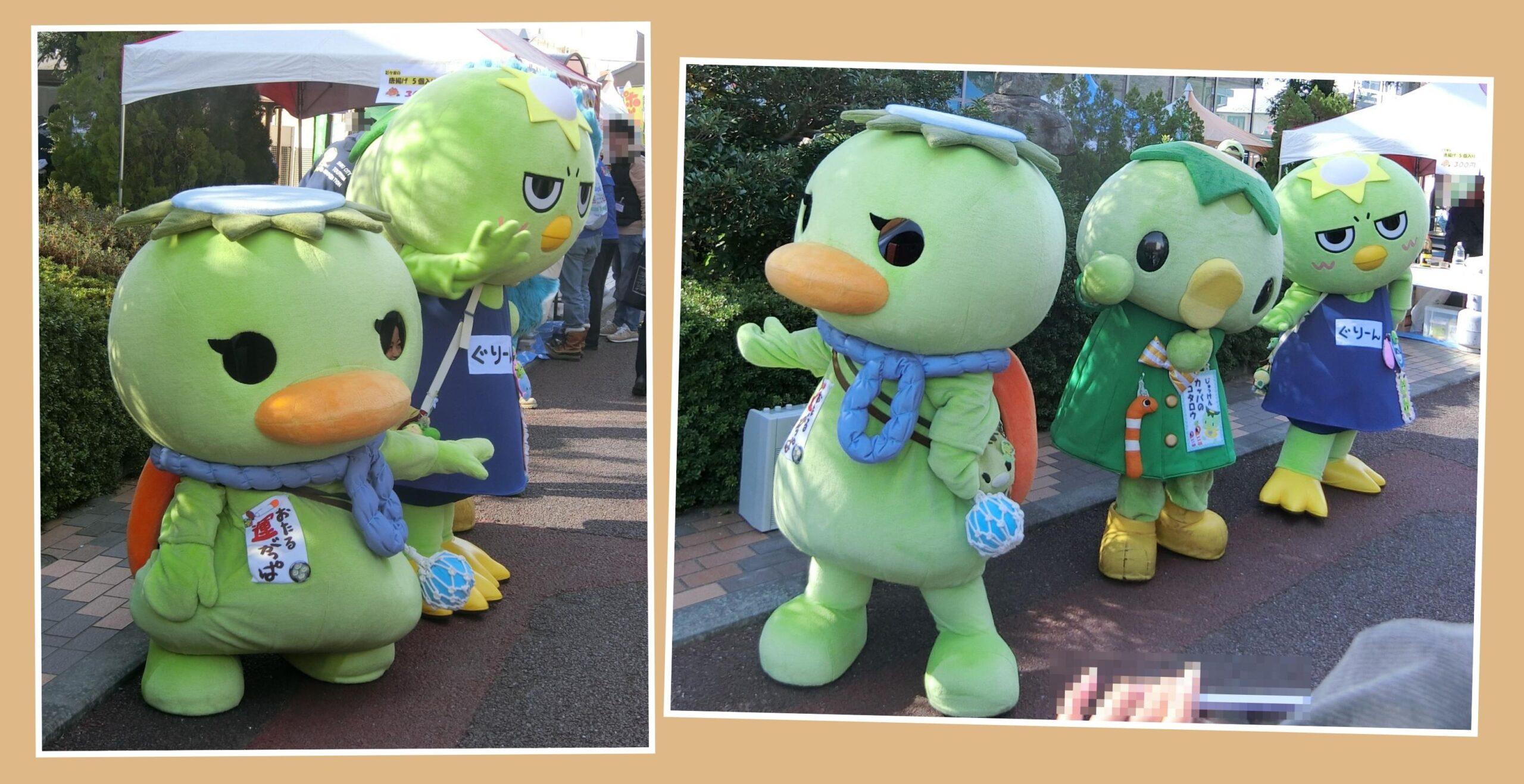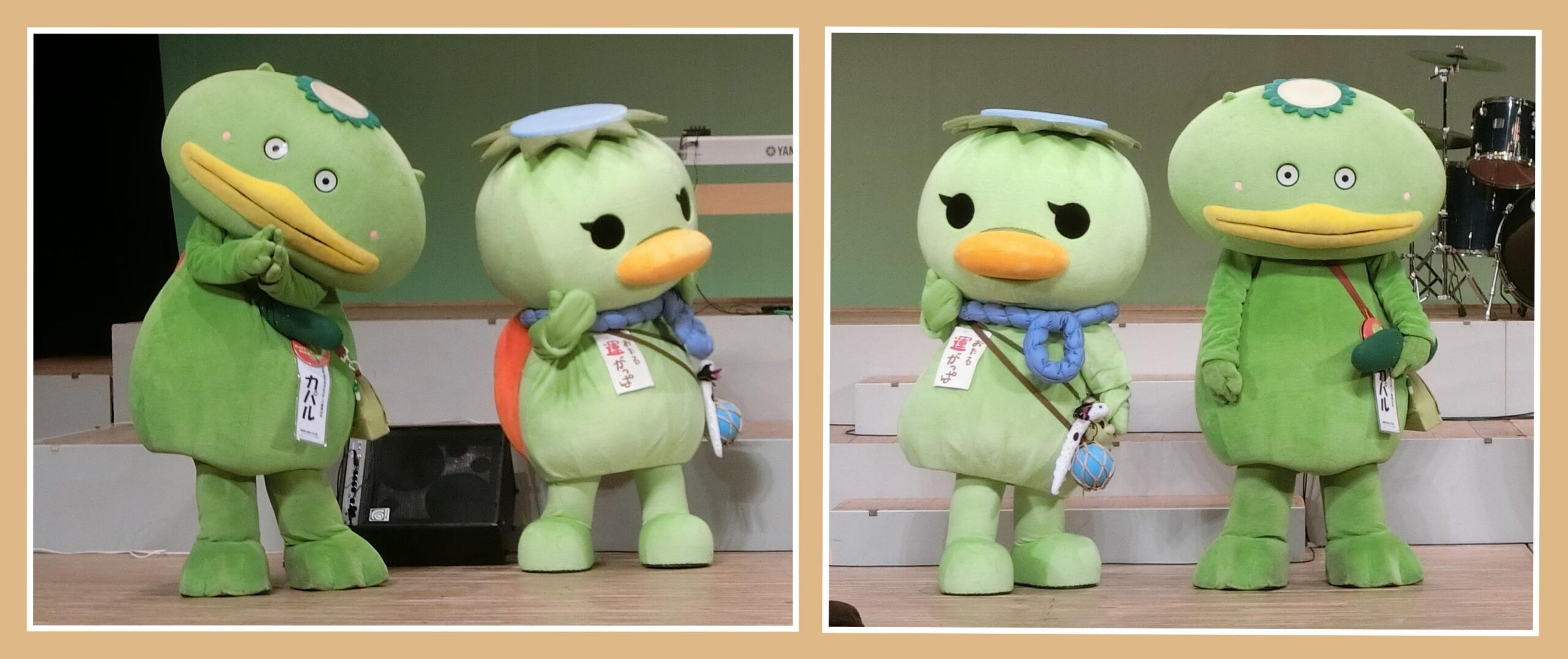 カッパがモチーフのキャラクターが大集合です。(右から)「かっぴー」(埼玉県志木市)、「ゆずがっぱ」(徳島県那賀町)、と一緒です。
