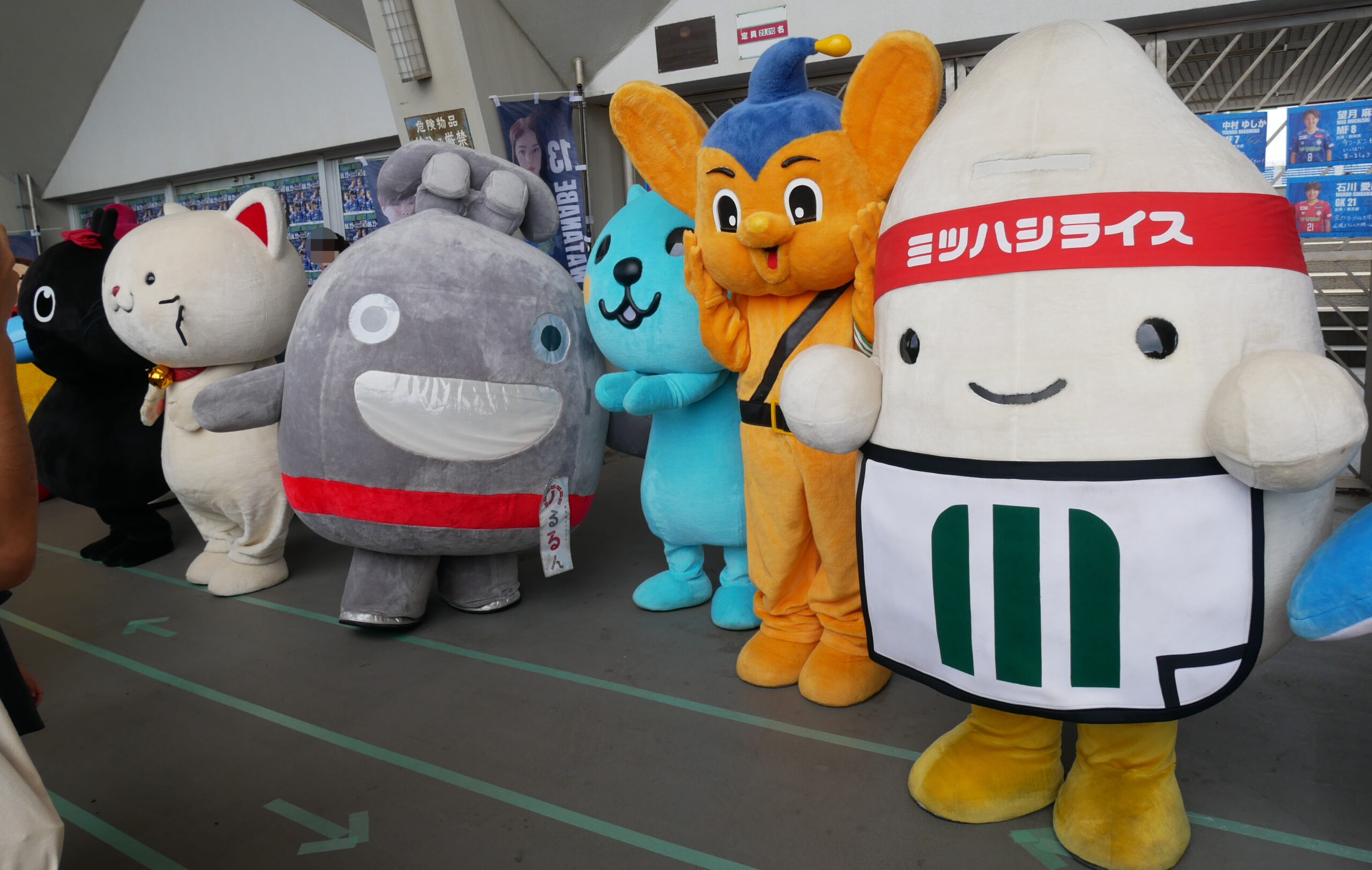 こちらの写真は、2024年に駒沢オリンピック公園総合運動場陸上競技場で開催された「世田谷区民DAY」より、(右側より)「ミツハシくん」(株式会社ミツハシ)、(右側より)「トリニィー」(スフィーダ世田谷FC)、「のるるん」(東急電鉄株式会社)、「Qoo(クー)」(日本コカ・コーラ社)とのコラボです。