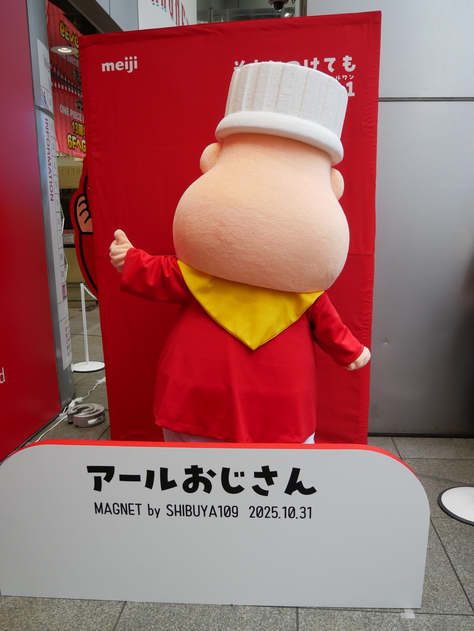 こちらの写真は、2025年に東京渋谷にあるMAGNET by SHIBUYA109で開催された「アールおじさん」のお披露目会より、「アールおじさん」の登場です。ホント「カールおじさん」そっくりです。