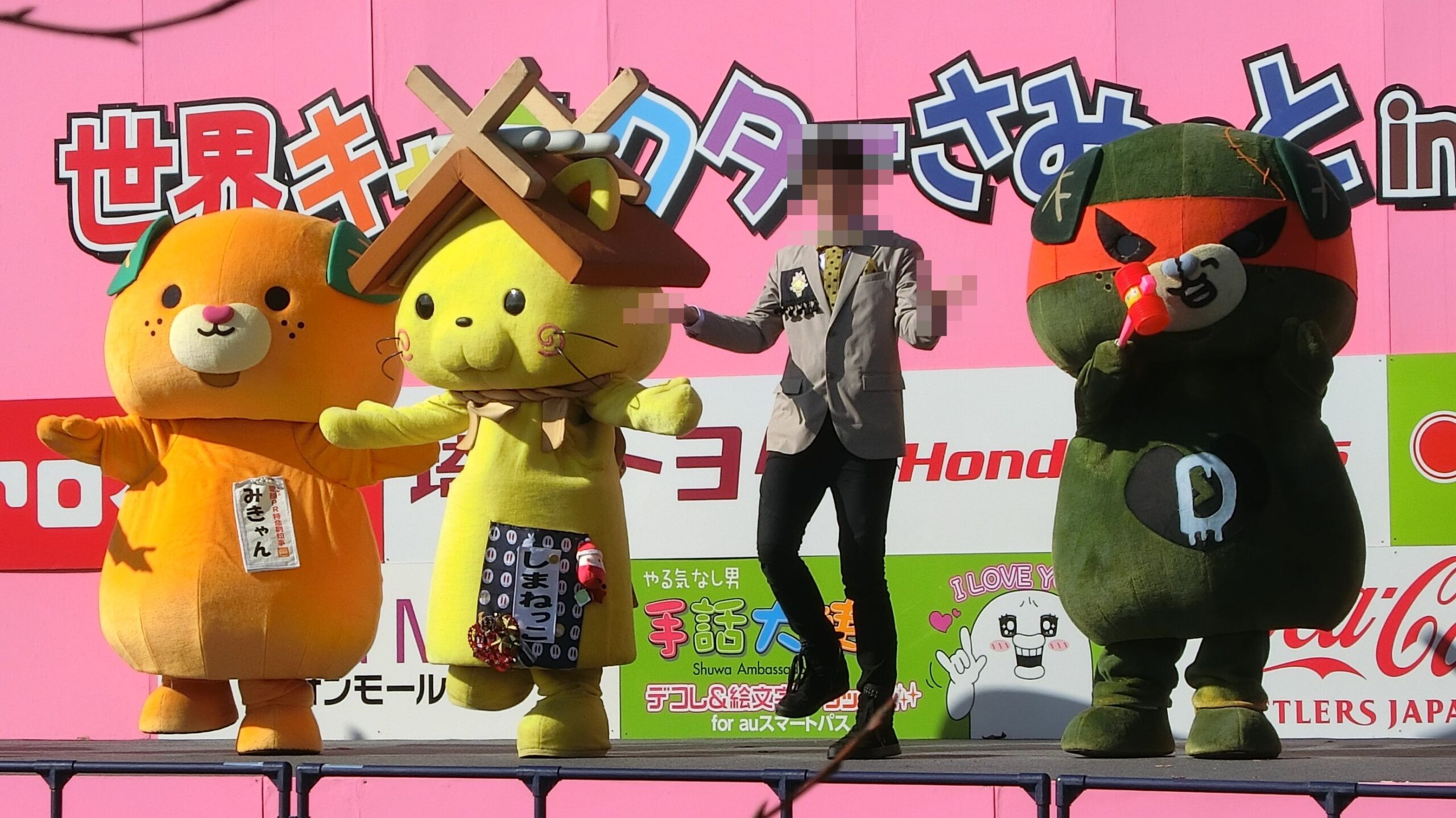2016年に埼玉県羽生市で開催された「世界キャラクターさみっとin羽生」では、安来節(どじょうすくい踊り)という郷土民謡を披露しました。(右側の)「しっぺい」と一緒に記念撮影です。