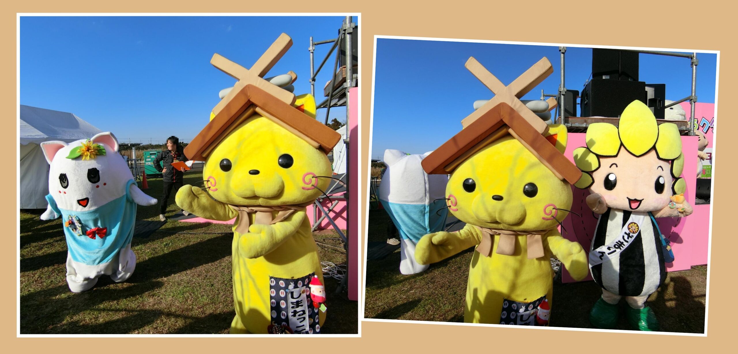 こちらの写真は、2017年の「世界キャラクターさみっとin羽生」より、(右から)「あゆコロちゃん」(神奈川県厚木市)、「しっぺい」(静岡県磐田市)とのコラボです。