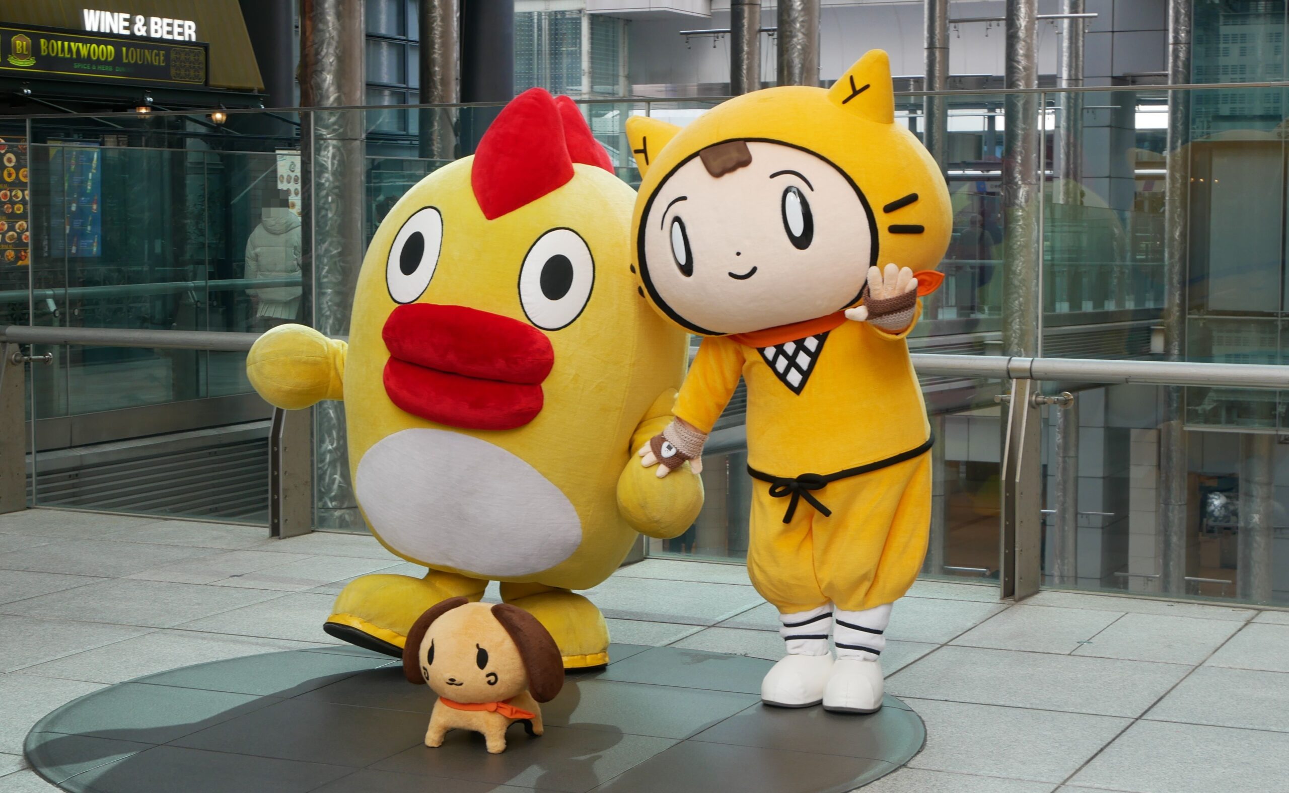 こちらの写真は、2026年に東京汐留にある日本テレビで開催された「シノビー×そらジロー コラボグッズ発売記念!グリーティング」より、(右側の)「シノビー」と(中央の)「ニン丸」(いずれも読売テレビ放送)と読売グループのキャラクター同士のコラボです。