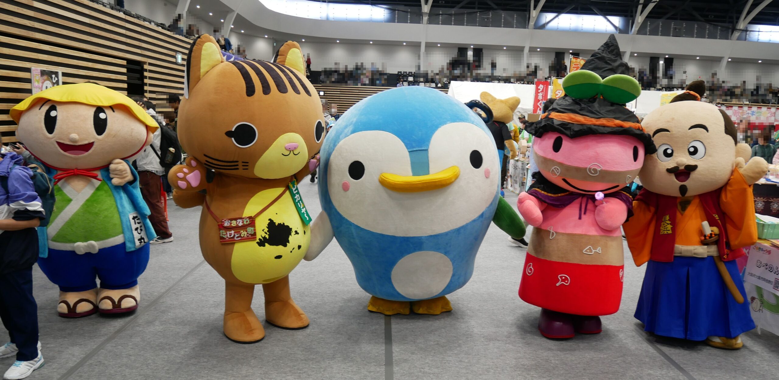 (右側から2番目の)「丹波竜のちーたん」(兵庫県丹波市)、(右側から4番目の)「ピカリャ~」(沖縄県八重山郡竹富町)とのコラボです。