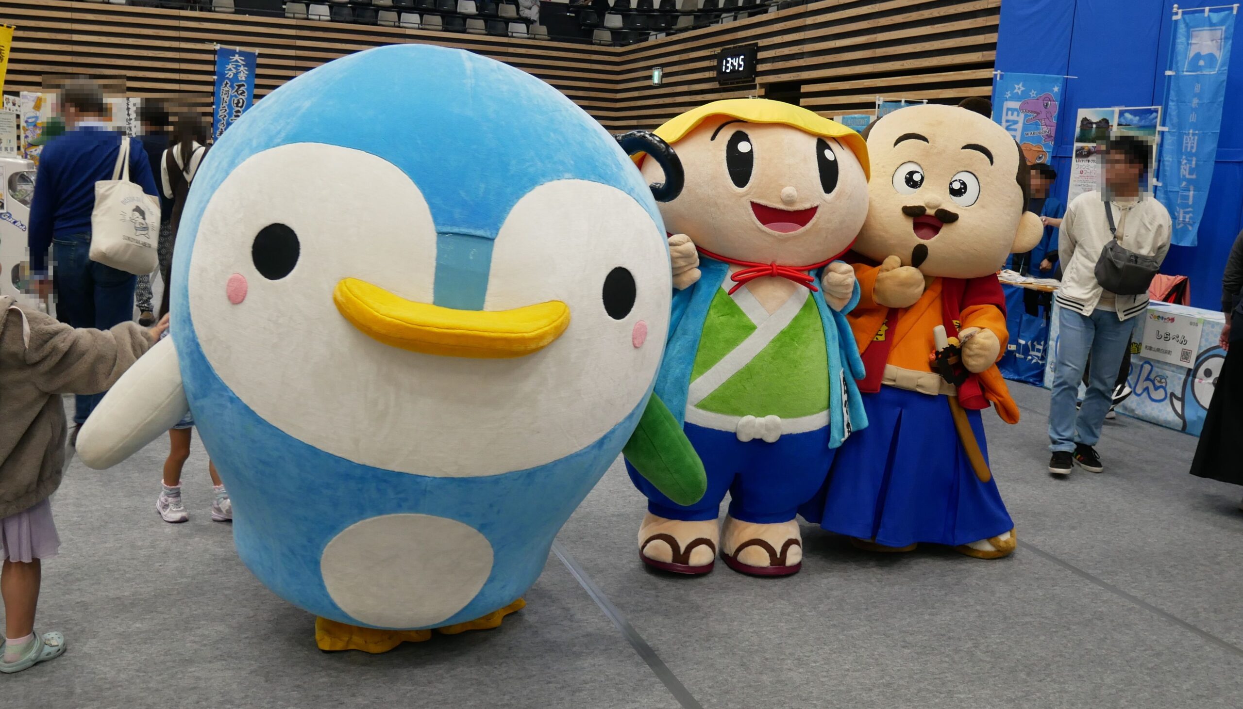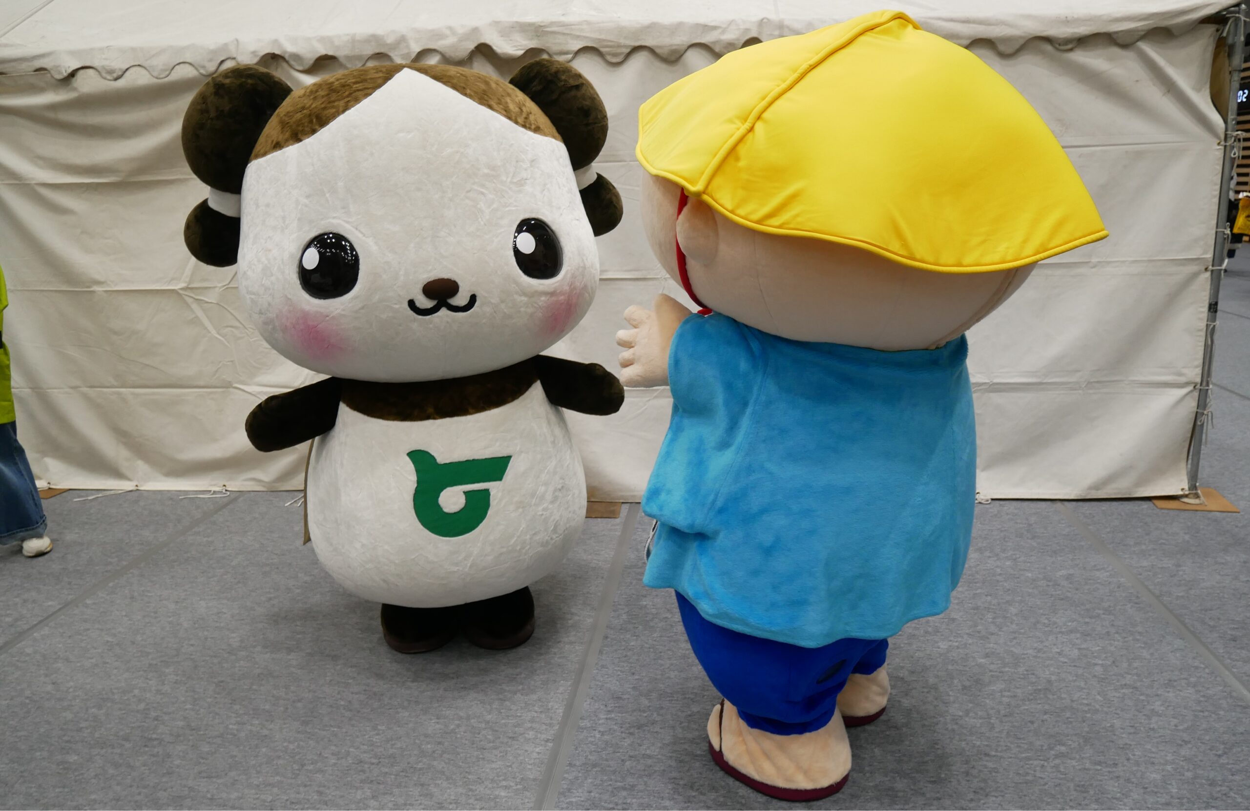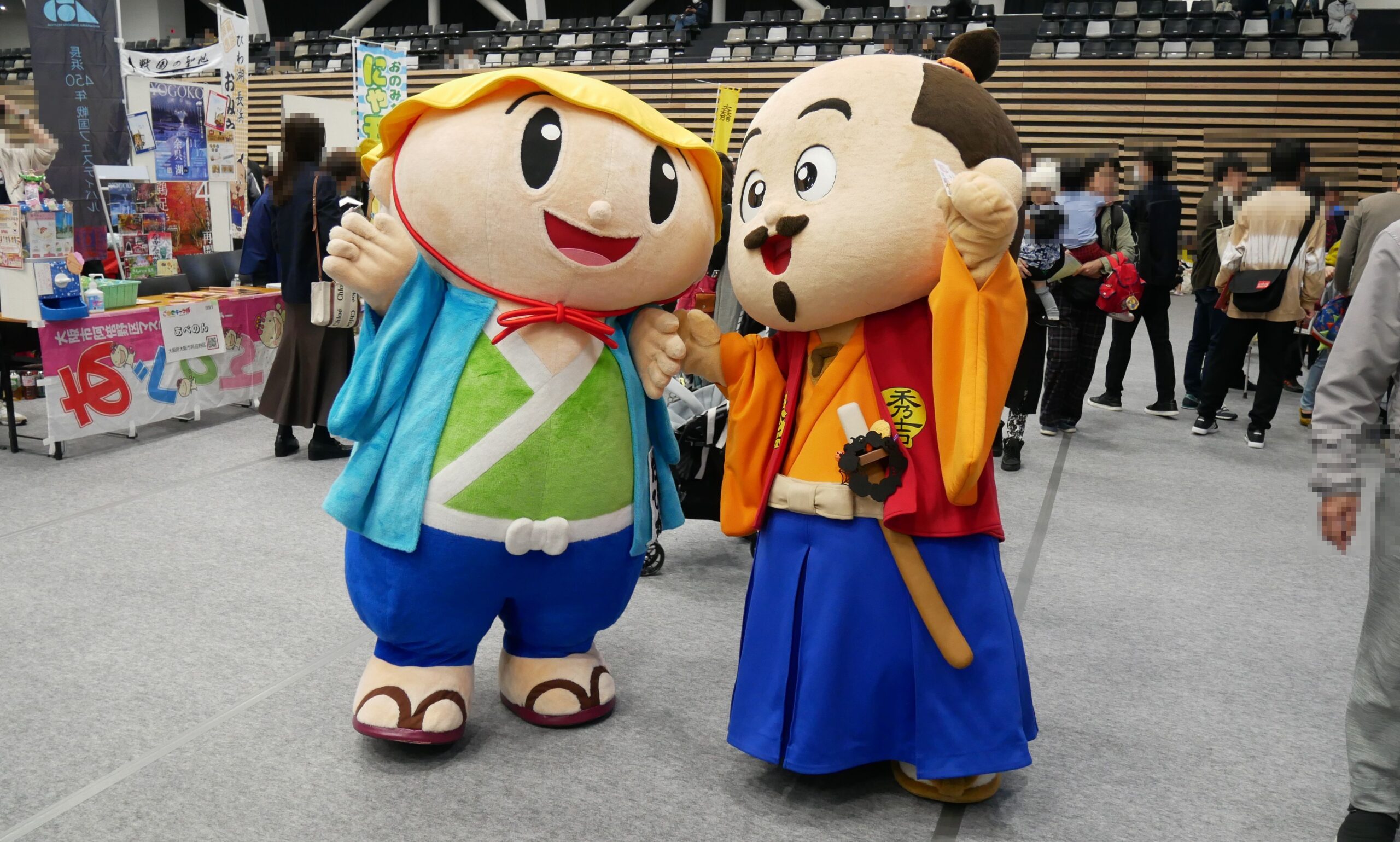 こちらの写真は、2023年に滋賀県彦根市にあるプロシードアリーナHIKONEでに開催された「ご当地キャラ博in彦根2023」より、(左側の)「三太」(富山県中新川郡上市町)、(右側の)「にんじゃえもん」(滋賀県甲賀市)とのコラボです。