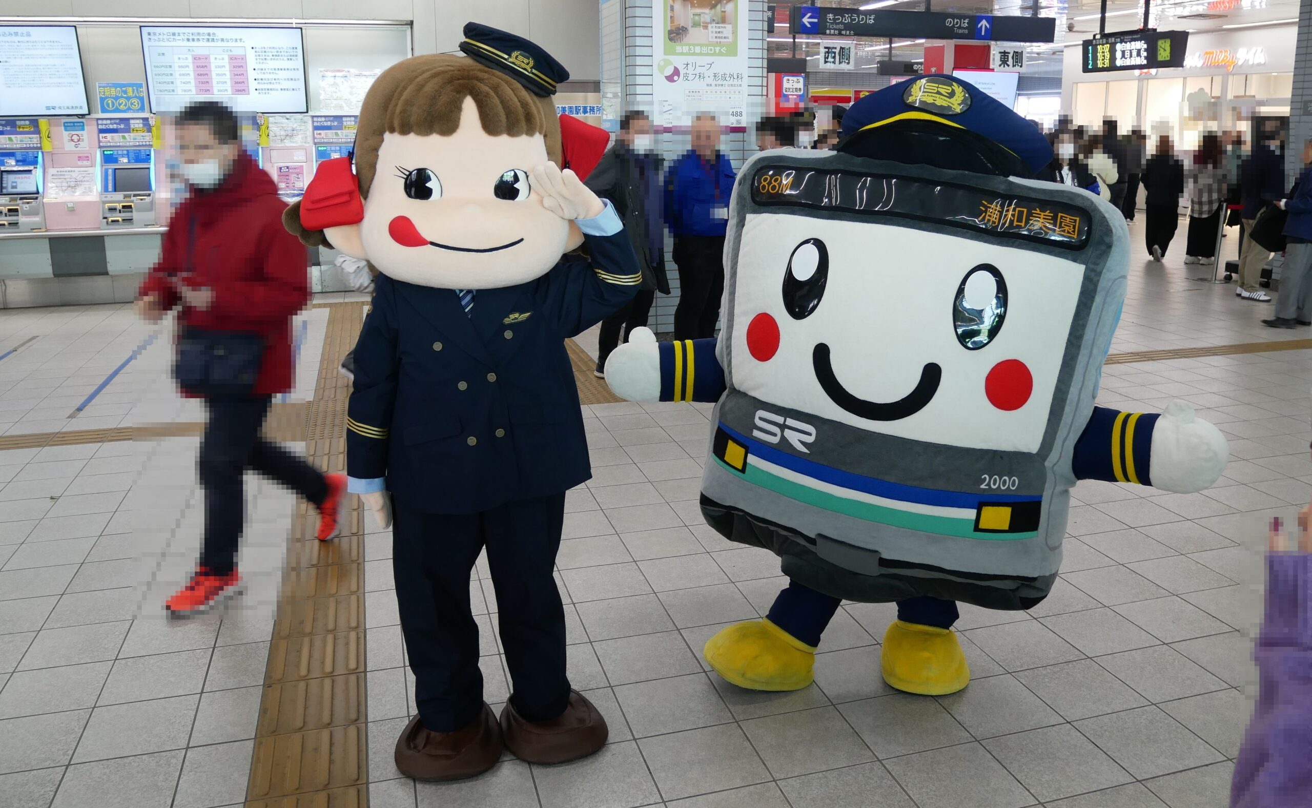 こちらの写真は、2025年に、埼玉県にある浦和美園駅改札口付近にて、(左側の)「ペコちゃん」(株式会社不二家)との夢のコラボです。この日は浦和美園駅前にて「ペコちゃんmilkyタイム 浦和美園店」オープンの日でした。