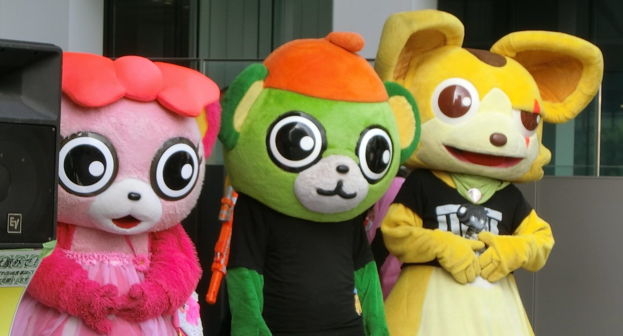 下の写真は、2018年10月の「第31回 しながわ夢さん橋2018」より、右の「しんじょうくん」(高知県須崎市)、(左から)「まんべくん」(北海道山越郡長万部町)、「スパンキー」と一緒です。