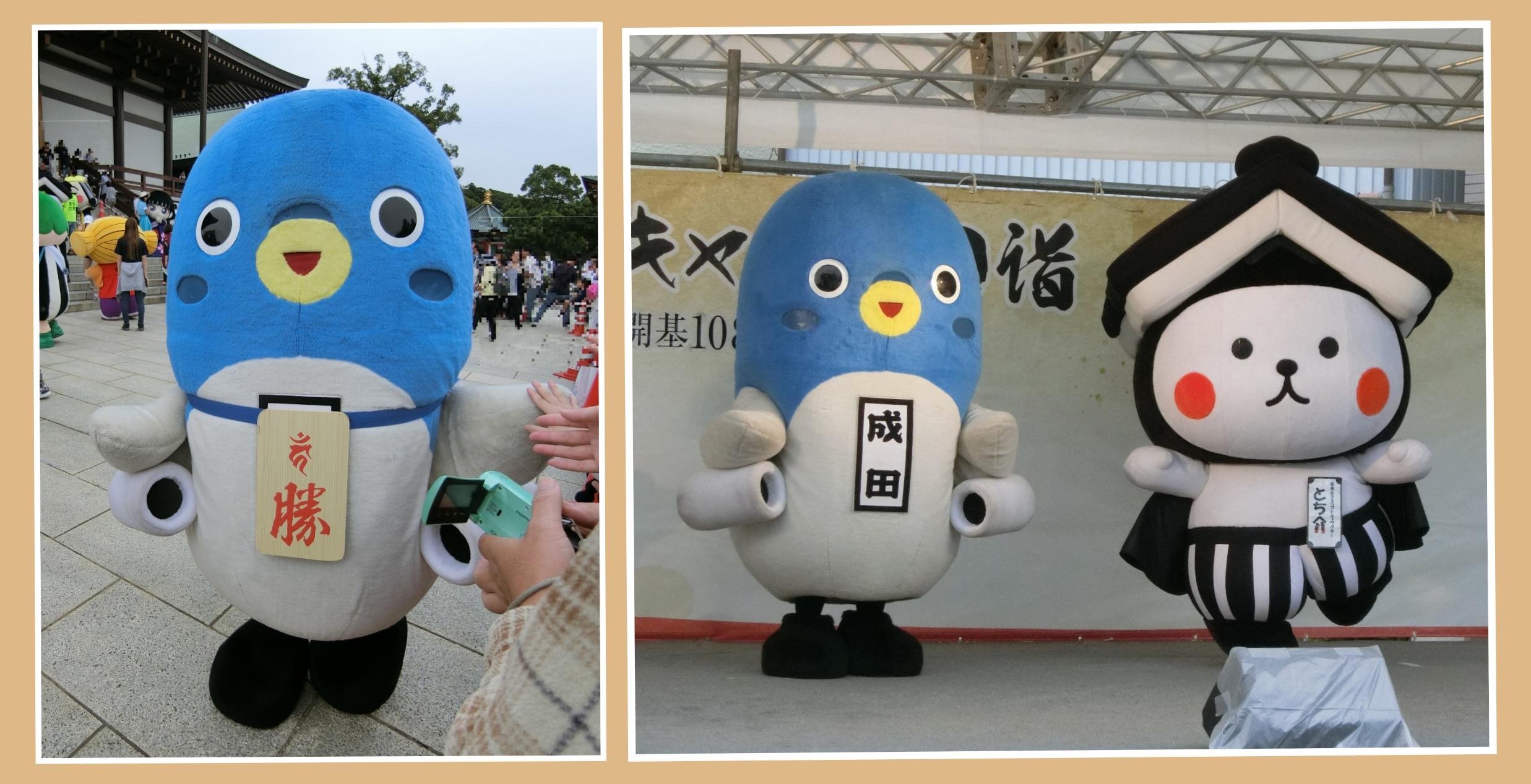 こちらの写真は、2017年の「ご当地キャラ成田詣」より、(右側の)「とち介」(栃木県栃木市)とのコラボです。