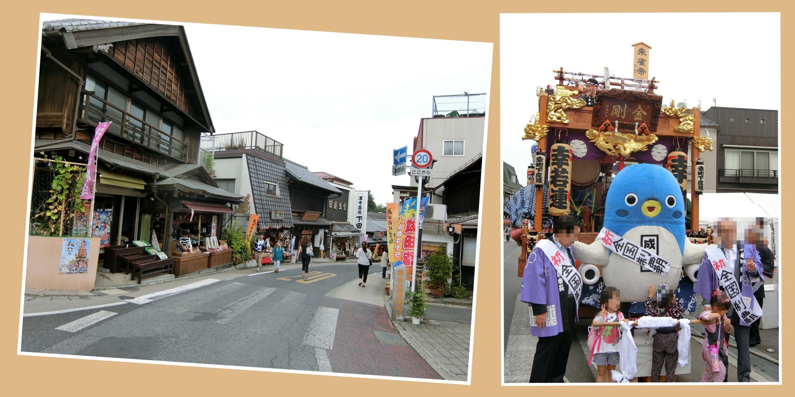 成田駅から、成田山新勝寺へ800m続く表参道沿いには、成田名物のうなぎ料理の飲食店や、お土産屋さんがたくさん並んでいます。2017年の「ご当地キャラ成田詣」では、表参道沿いに山車が通り、「うなりくん」も山車にも乗りました。