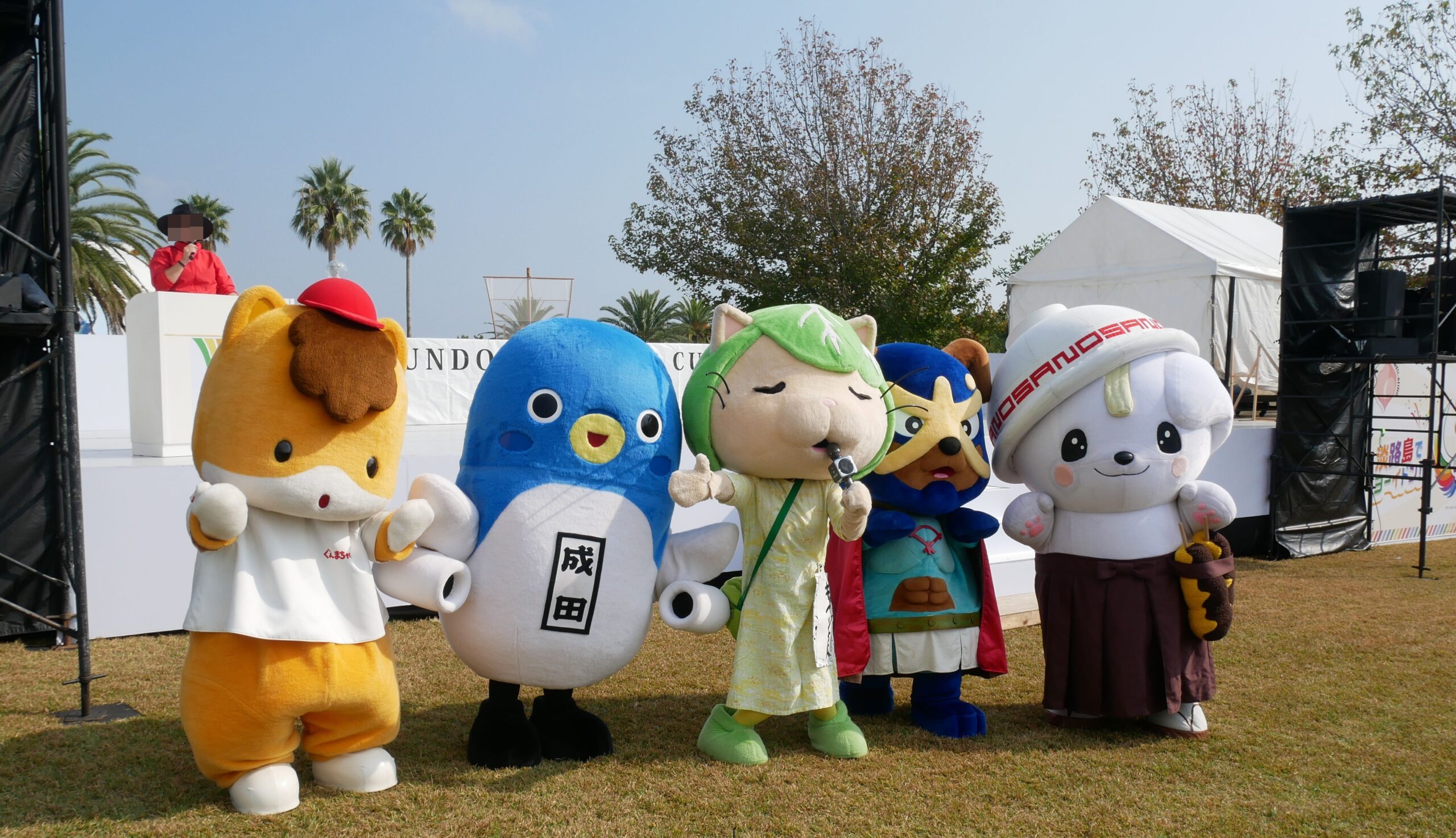こちらの写真は、2023年に兵庫県の淡路島にある淡路島国営明石海峡公園で開催された「ゆるバースinはじまりの島 あわヂカラ」より、(左側の)「たかたのゆめちゃん」(岩手県陸前高田市)とのゆるキャラグランプリ歴代チャンピオン同志のコラボです。