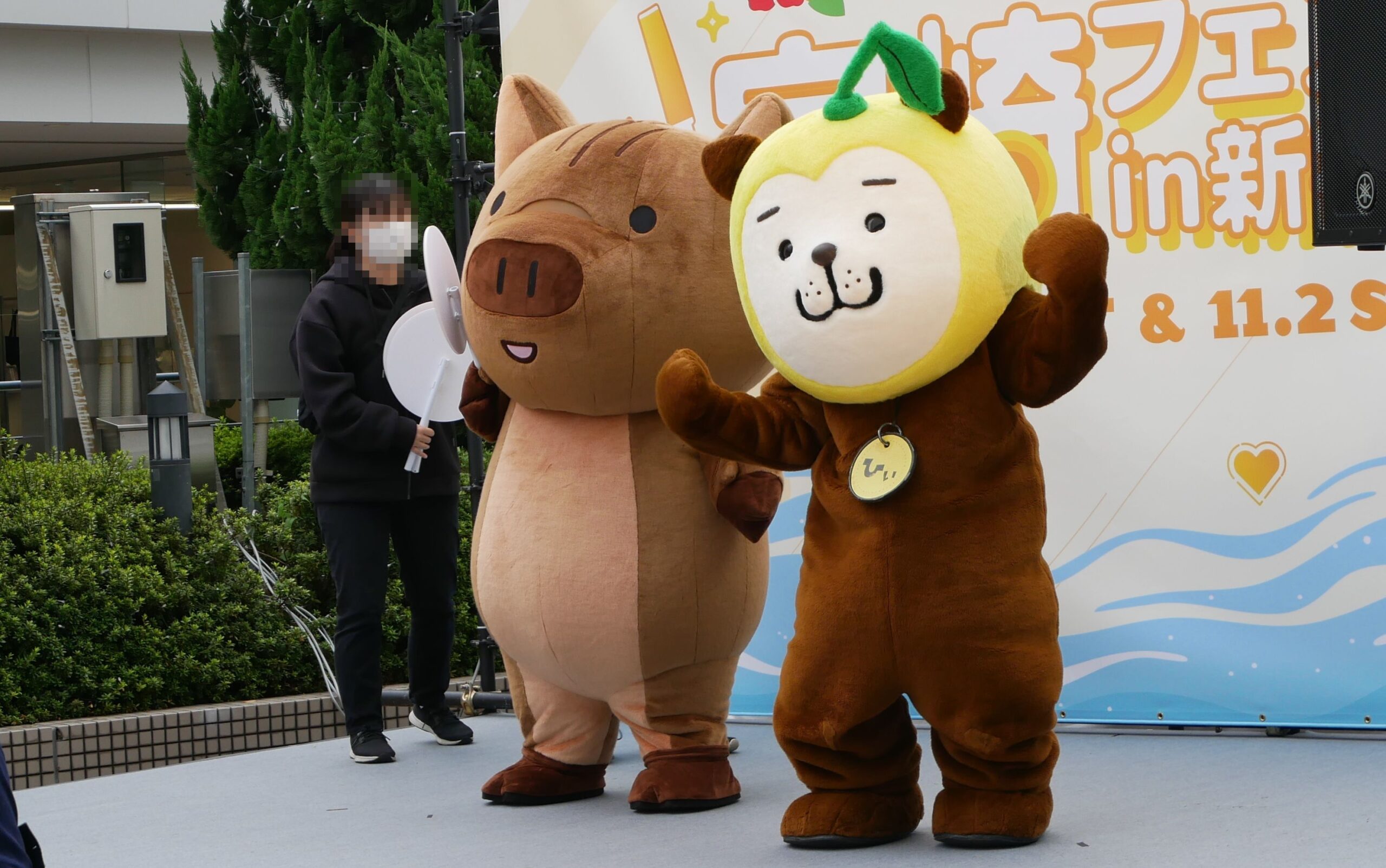 (右側の)日向夏のかぶりものをかぶった「みやざき犬」の「ひぃくん」(宮崎県)との、宮崎県の名産の日向夏キャラクターと小説家の日向夏との日向夏つながりの奇跡のコラボです。